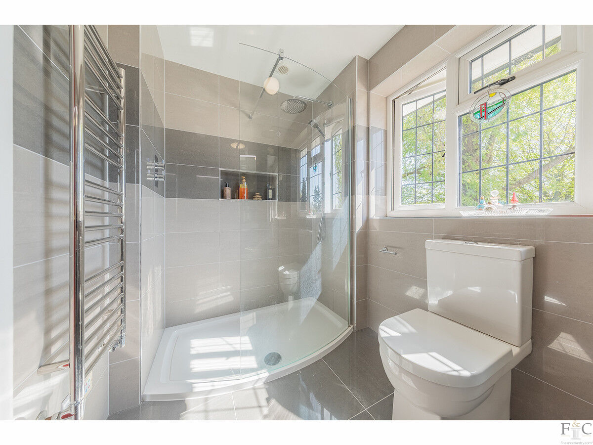 The master suite is a haven of calm, featuring a separate dressing room, a private study, and a sleek modern en-suite. Another double bedroom enjoys its own en-suite shower room, while the remaining two benefit from built-in wash basins and garden views. A family bathroom, beautifully finished with a bath and separate shower, completes the upper floor.