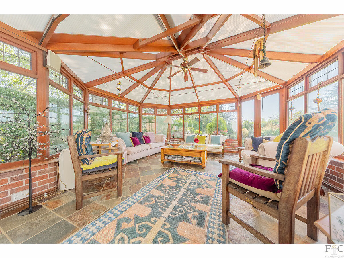 From the lounge, glazed doors lead into a glorious sunroom — a space where timber beams, slate flooring, and panoramic glazing create the perfect place to sit, read, dine or simply admire the serene garden beyond. The south-facing rear garden becomes an extension of this room, inviting nature in, all year round.