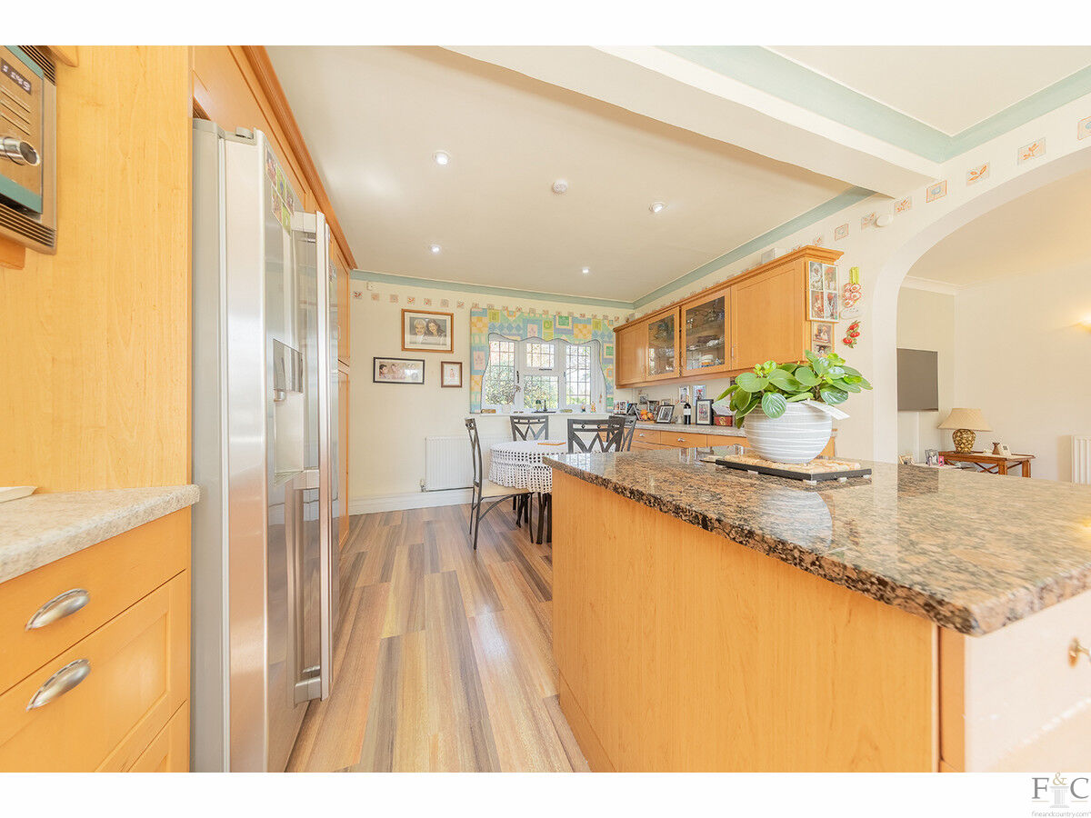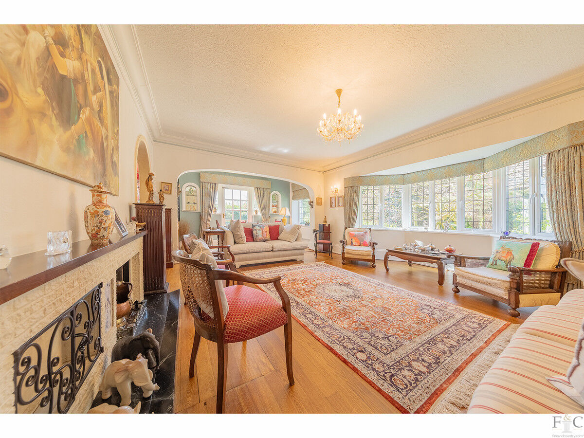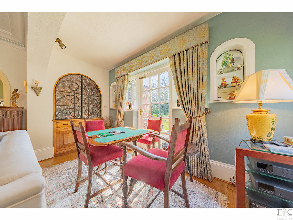 To the right, the formal sitting room stretches wide and inviting, crowned with an elegant bay window that floods the room with natural light. A feature fireplace, bespoke bar area, and French doors leading to the sun-soaked south-facing garden combine to create a space ideal for both peaceful moments and vibrant gatherings.