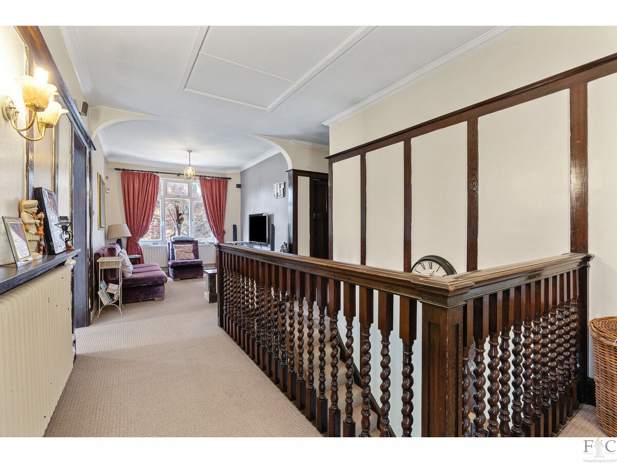 The original staircase to the first floor leads from the hallway, giving a great sense of movement throughout this home. The hallway also leads to the family room, living room, sitting room and kitchen/diner with utility and pantry, and downstairs cloakroom. The layout flows smoothly downstairs, keeping a real feel of space. Original panelling, coving, ceiling roses and doors showcase this property’s period charm – and the wooden parquet flooring is just stunning.