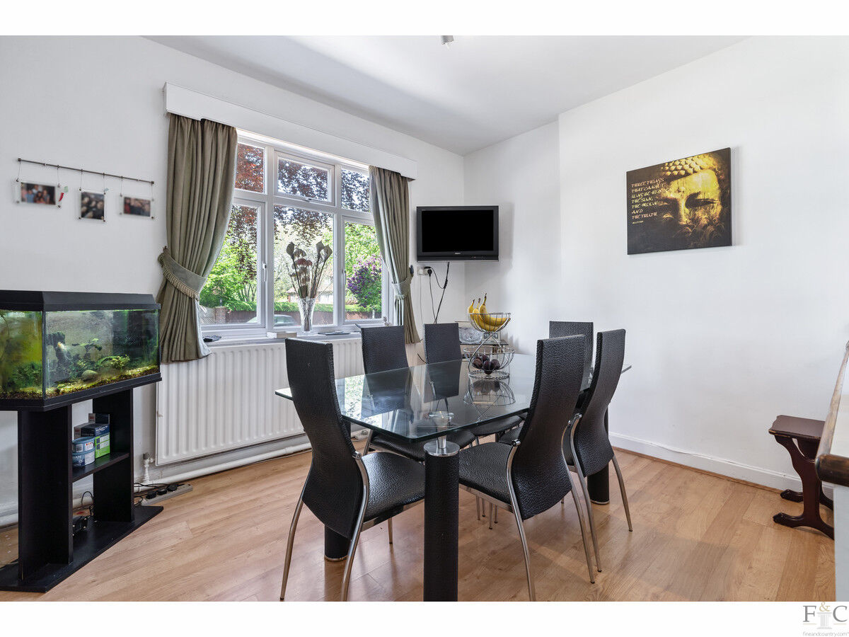 The living room, with original coving, ceiling rose and more of that fabulous flooring is light and bright thanks to the dual aspect windows and french doors leading directly into the garden, filling the room with natural light. The feature fireplace adds yet more character and the neutral décor is in perfect harmony with the rest of this home.