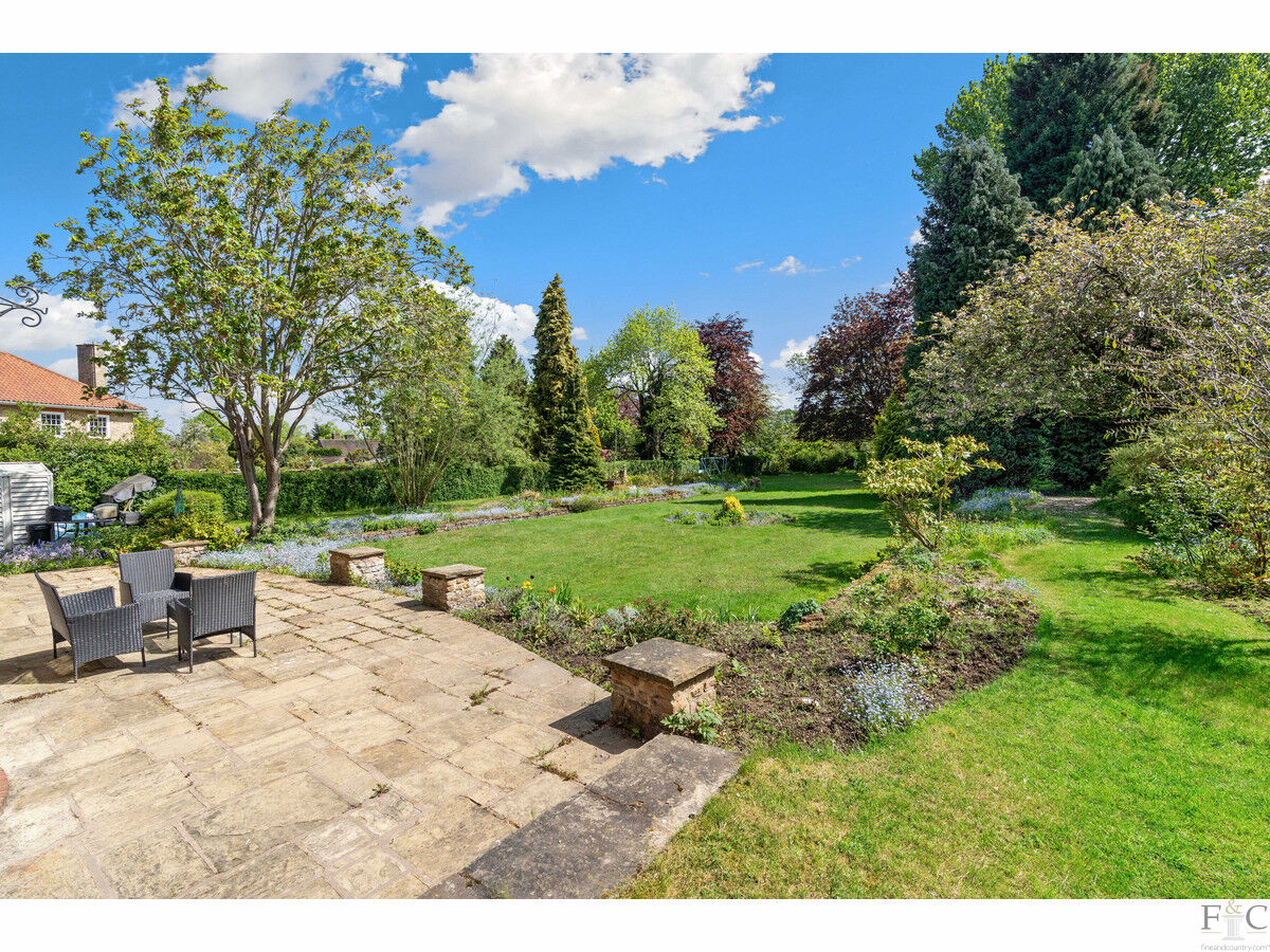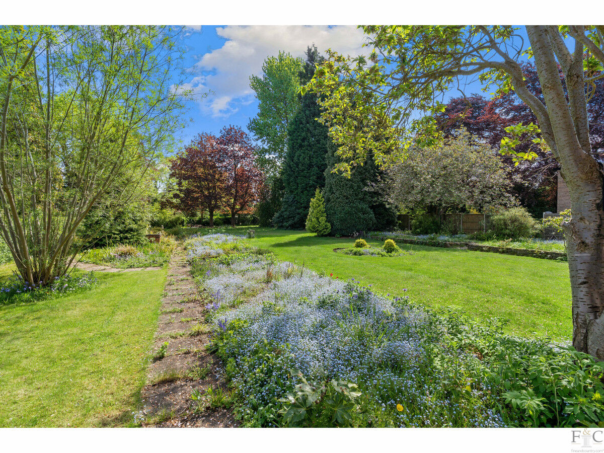 The outside space around this home is absolutely lovely – and huge – with a plot size of over half an acre. The patio and large lawns with meandering grassy pathways leading to secluded spots are all great spaces to relax and entertain, and the established, hedged boundaries with borders of shrubs and trees give a real sense of exclusivity, privacy and peace. The budding potential is clear to see.