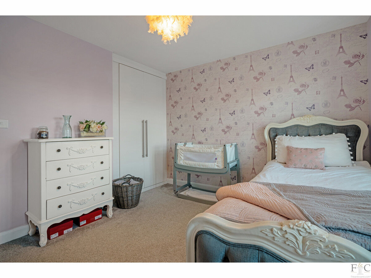 This attention to detail continues as we enter into the office. Here, a medium oak integrated unit allows space for display and all the paraphernalia of a’ work from home’ environment. There is ample room to efficiently stow away paperwork and files above and around a spacious desk area. It is conveniently alongside a downstairs cloak room, comprised of a two piece white suite. The office overlooks the front of the property and is across the hall from the living room.