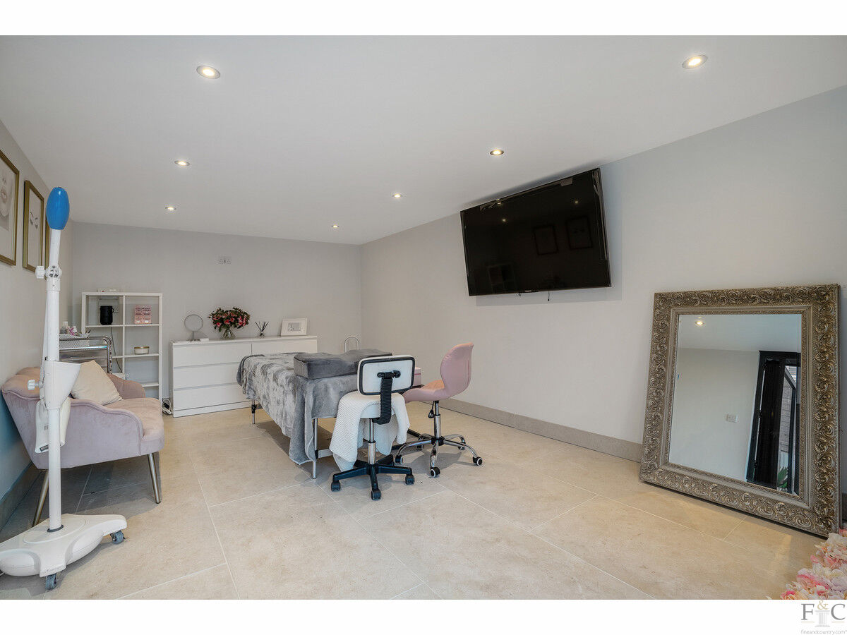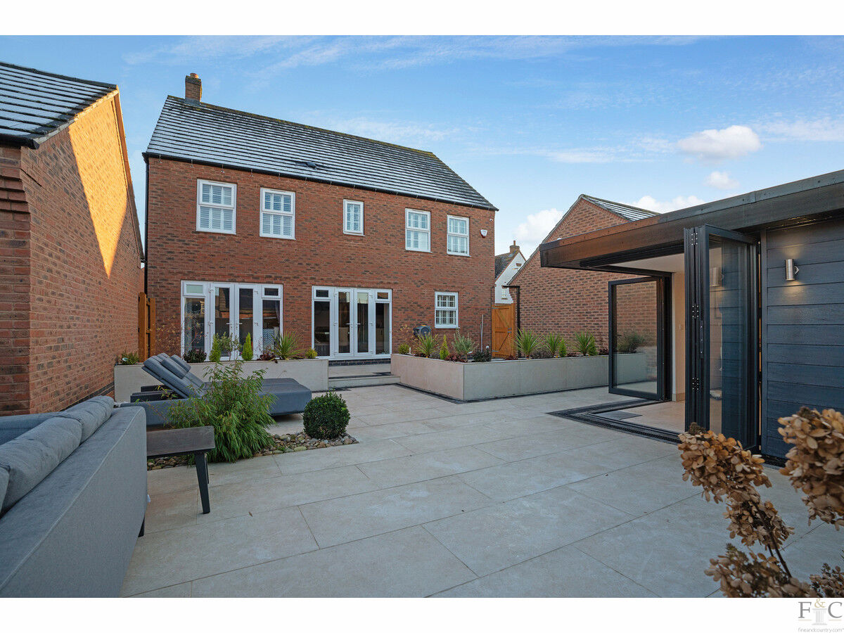 Here, through patio doors, the garden beckons for day time gatherings or evening star gazing in the enclosed and private landscaped garden. The kitchen and living room become easily accessible and the potential for space improves many times over, with the landscaped garden providing a substantial attraction. The garden also has the excellent provision of a large garden office and is safely enclosed too, ideal for younger members of the family to enjoy and play in.