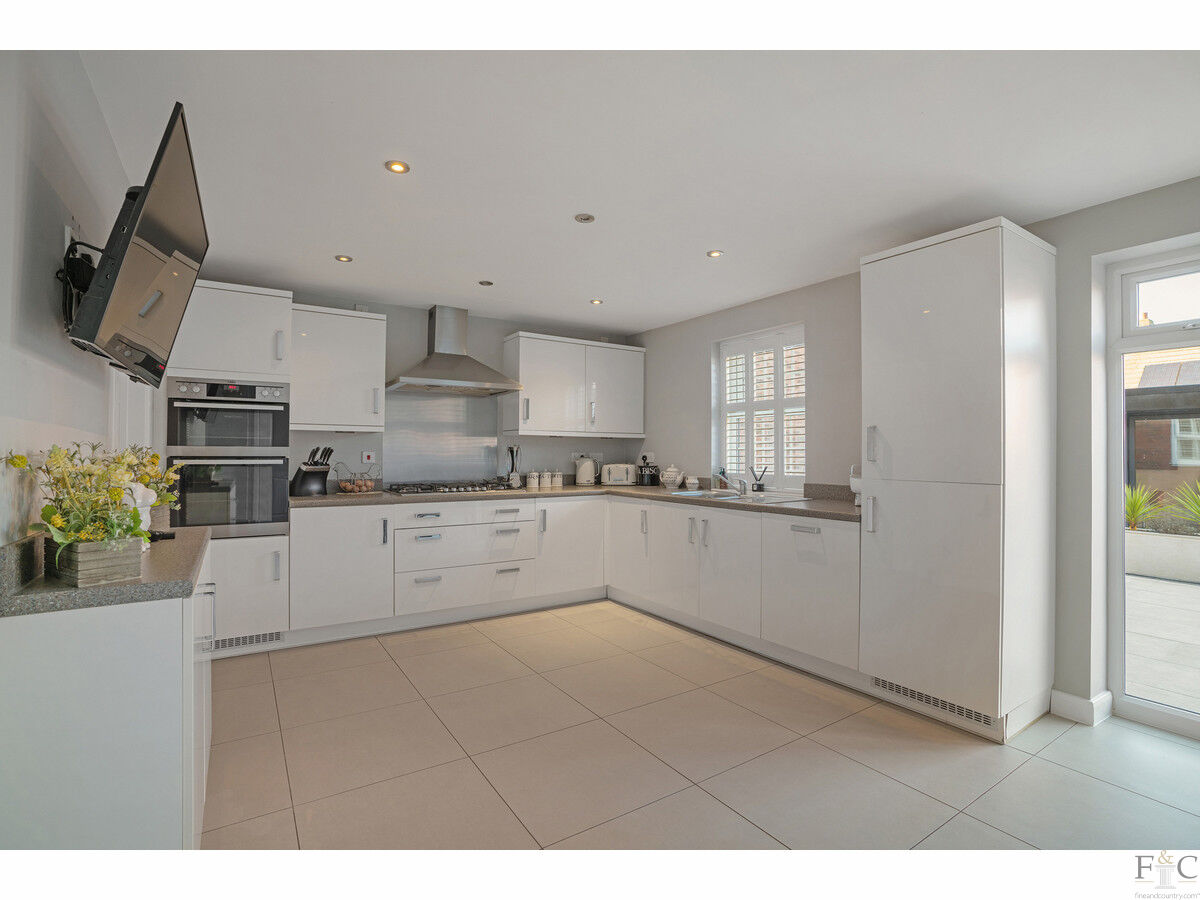 In the kitchen, there is a generous flow of quartz work tops, above which the white cabinetry with brushed steel handles, make this kitchen totally practical yet immediately striking. Ample storage space and integrated appliances including a gas hob with extractor hood, a double electric oven, fridge freezer and dishwasher, combine seamlessly to leave this room feeling uncluttered and spacious. An adjoining door to the utility room provides additional space for storage and plumbing for a washing machine and tumble drier. The utility room also has a door leading outside to the drive so serves as a perfect entry point for leaving muddy boots after a wet walk or school run. Perfect!