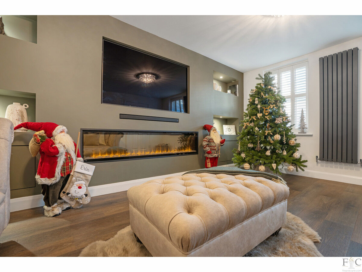 The living room has as its main feature a Diplex fireplace that invites cosy viewings on the ideally positioned television stretching on the wall above it. There are recessed integrated shelves for display and hard flooring for convenience.