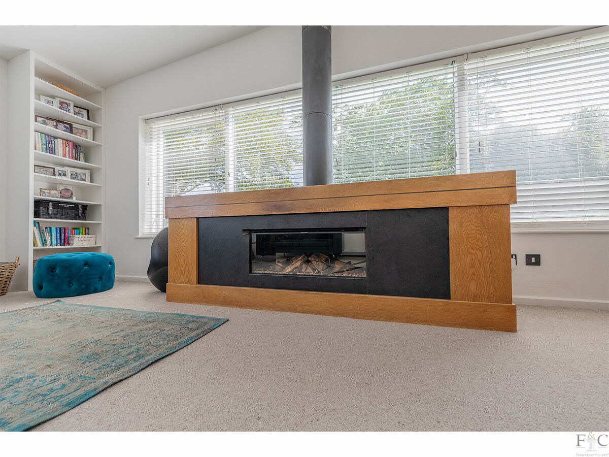 There are two distinct living rooms: the relaxed family lounge that opens onto the dining kitchen and a formal lounge/diner, both with dual aspects and garden views. The formal living/dining space features a contemporary electric stove, offering a stylish yet cosy backdrop for gatherings.