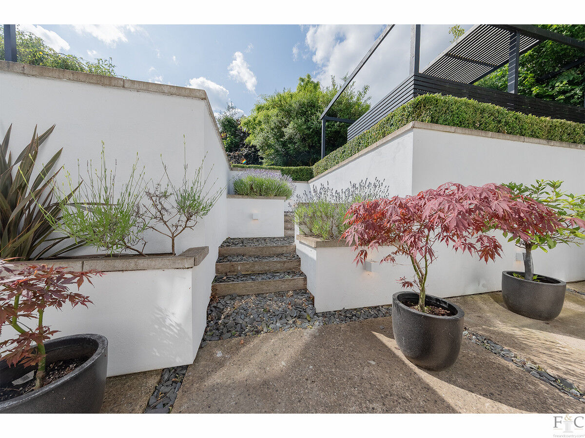The gardens envelop the house with a mix of structured planting and specimen trees, alongside a generous concrete terrace housing a built-in barbecue and stone pizza oven — ideal for alfresco entertaining in a truly private setting.