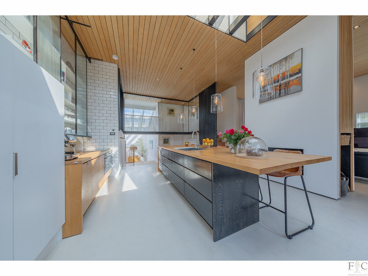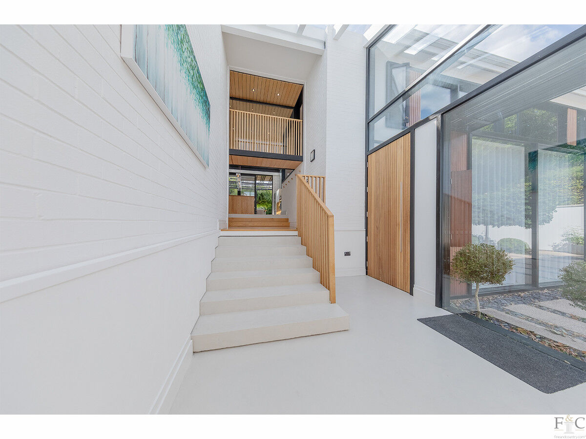 A dramatic entrance is made via a large hardwood pivot door beneath a suspended metal and timber canopy, leading into a bright, double-height atrium with overhead glazing, whitewashed brick walls, and warm microcement flooring. Light floods every corner of the house, enhanced by floor-to-ceiling glass, skylights, and carefully curated materials.