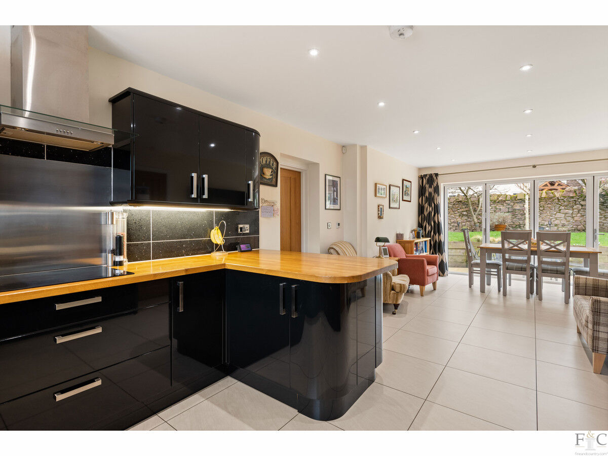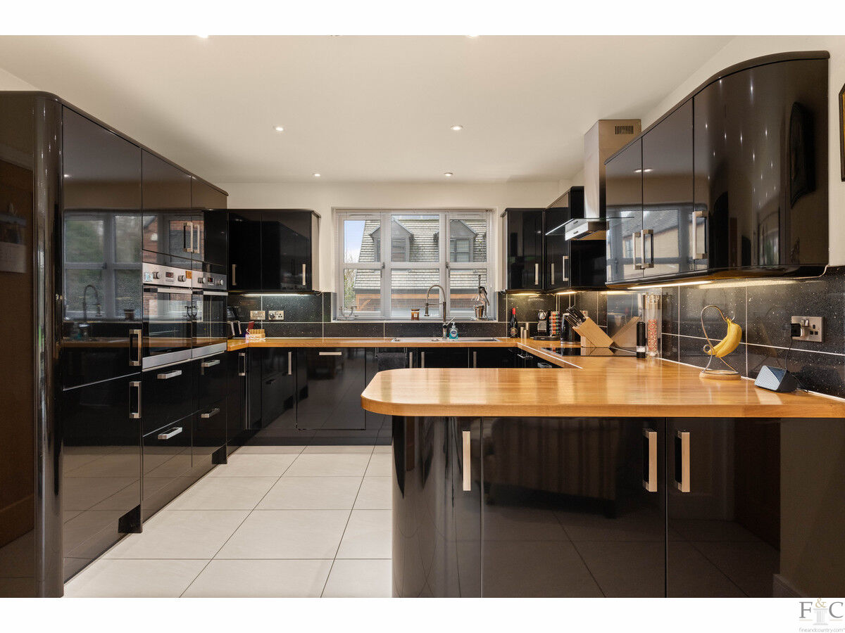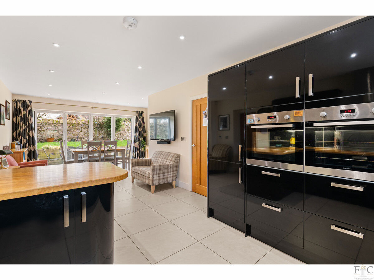 The kitchen area is fitted with a generous flow of black, high sheen wall and floor units, contrasting pale floor tiles and dark splash back tiles on three sides plus a further unit that acts as a double sided divider. As described, bi-folding doors are at the dining end and another window overlooks the front drive. The kitchen is fitted with double Lamona ovens, a Blomberg fridge freezer and dishwasher. A utility room immediately next door provides additional storage and space for all laundry needs. It is through the utility room that the garage can be entered, providing secure, easy entry into the house in all weathers.