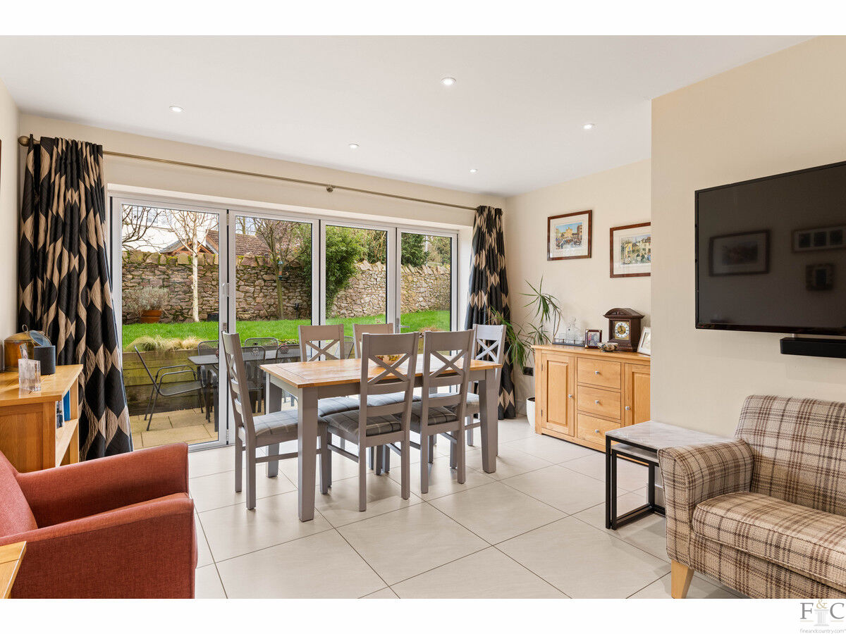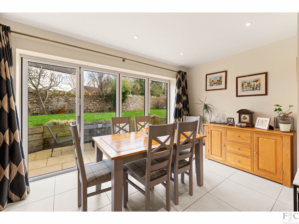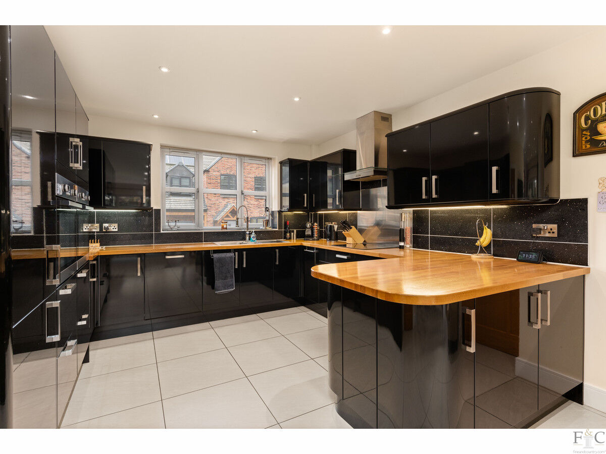 The kitchen area is fitted with a generous flow of black, high sheen wall and floor units, contrasting pale floor tiles and dark splash back tiles on three sides plus a further unit that acts as a double sided divider. As described, bi-folding doors are at the dining end and another window overlooks the front drive. The kitchen is fitted with double Lamona ovens, a Blomberg fridge freezer and dishwasher. A utility room immediately next door provides additional storage and space for all laundry needs. It is through the utility room that the garage can be entered, providing secure, easy entry into the house in all weathers.