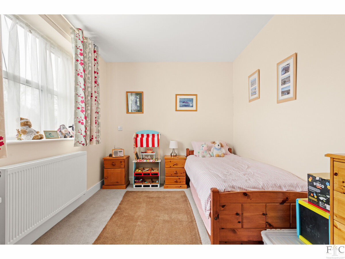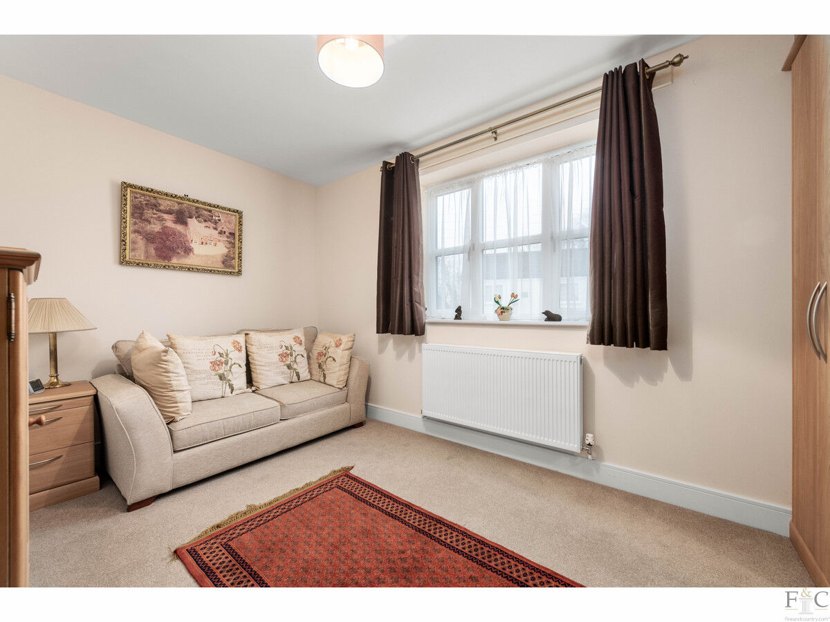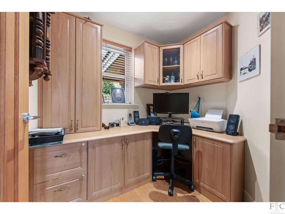 The study, complete with integrated desk and storage, is the next room and also has views into the rear garden. It is immediately next door to the cloakroom, fitted with a white toilet and basin.