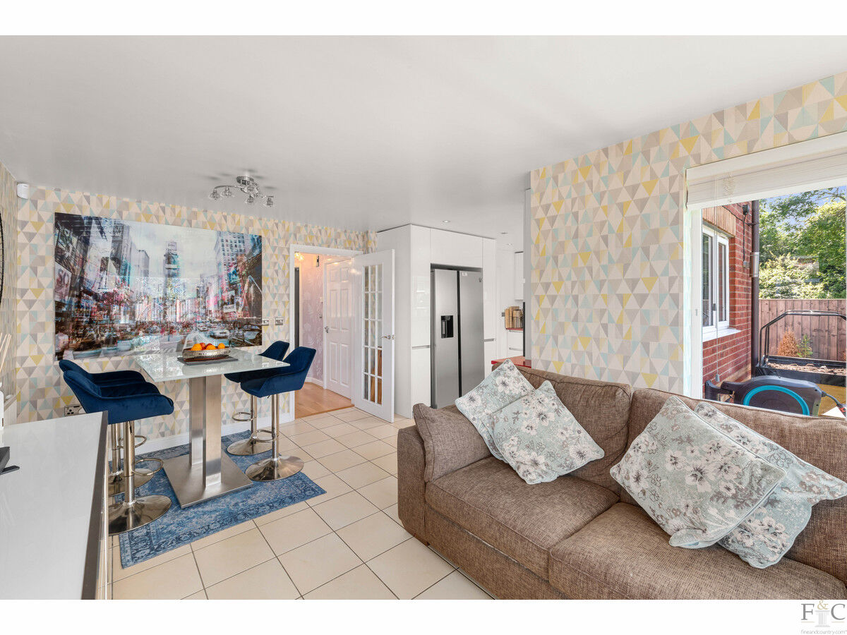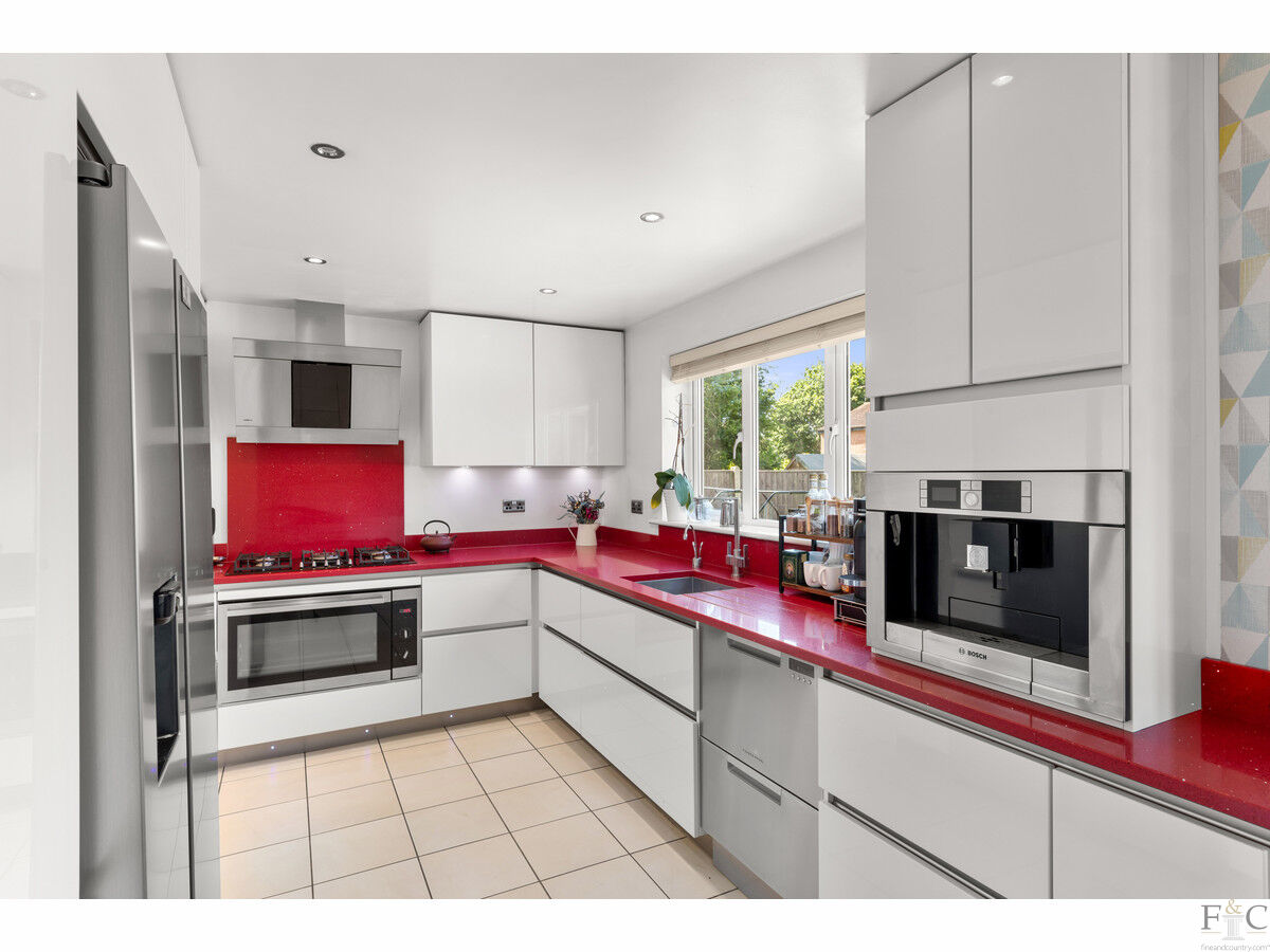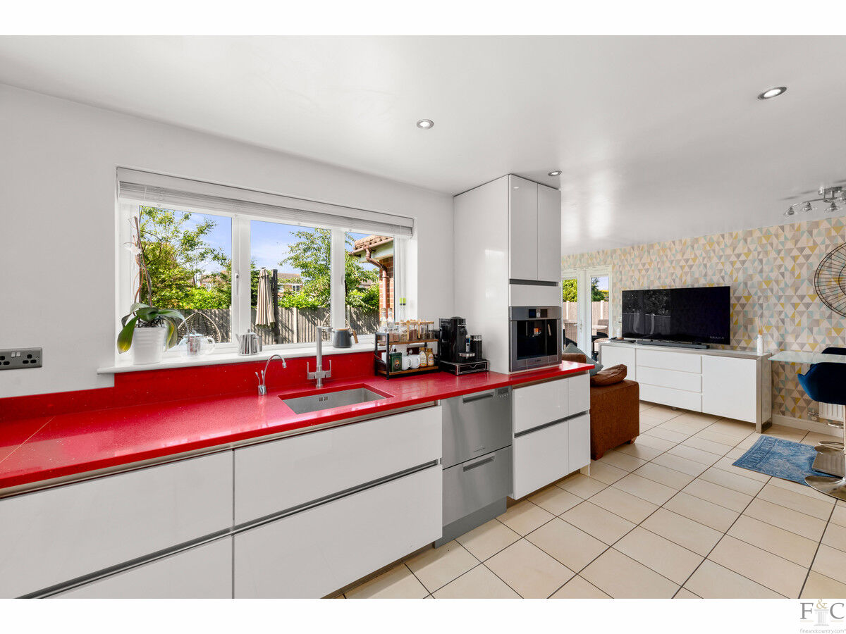 As we enter the kitchen diner the crisp white lines of the cabinetry and the contrasting red Silstone work tops and splashback, all make this generous space totally practical yet immediately striking. There is ample storage space and countertops for food preparation. The integrated appliances include a Stoves hob and oven with extractor hood and a dishwasher. Patio doors open from here into the low maintenance, landscaped, rear garden, making this relaxed family space very inviting and perfect for entertaining. It is sure to become the hub of the home, as it offers the potential for monitoring children and barbeque dining, for making the most of the secure outdoor space.