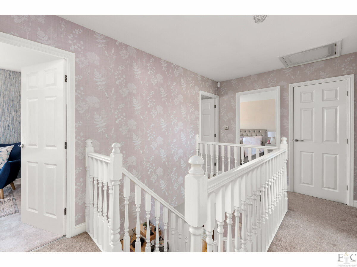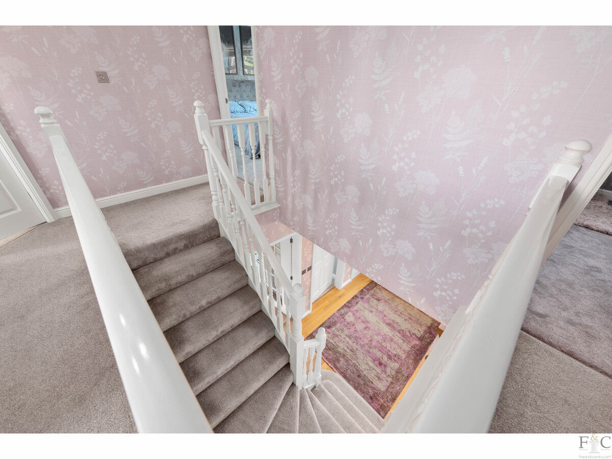 The relaxed feel of this lovely house is now continued as you climb upstairs. From the carpeted landing, the shape and twist of the staircase can be fully appreciated.