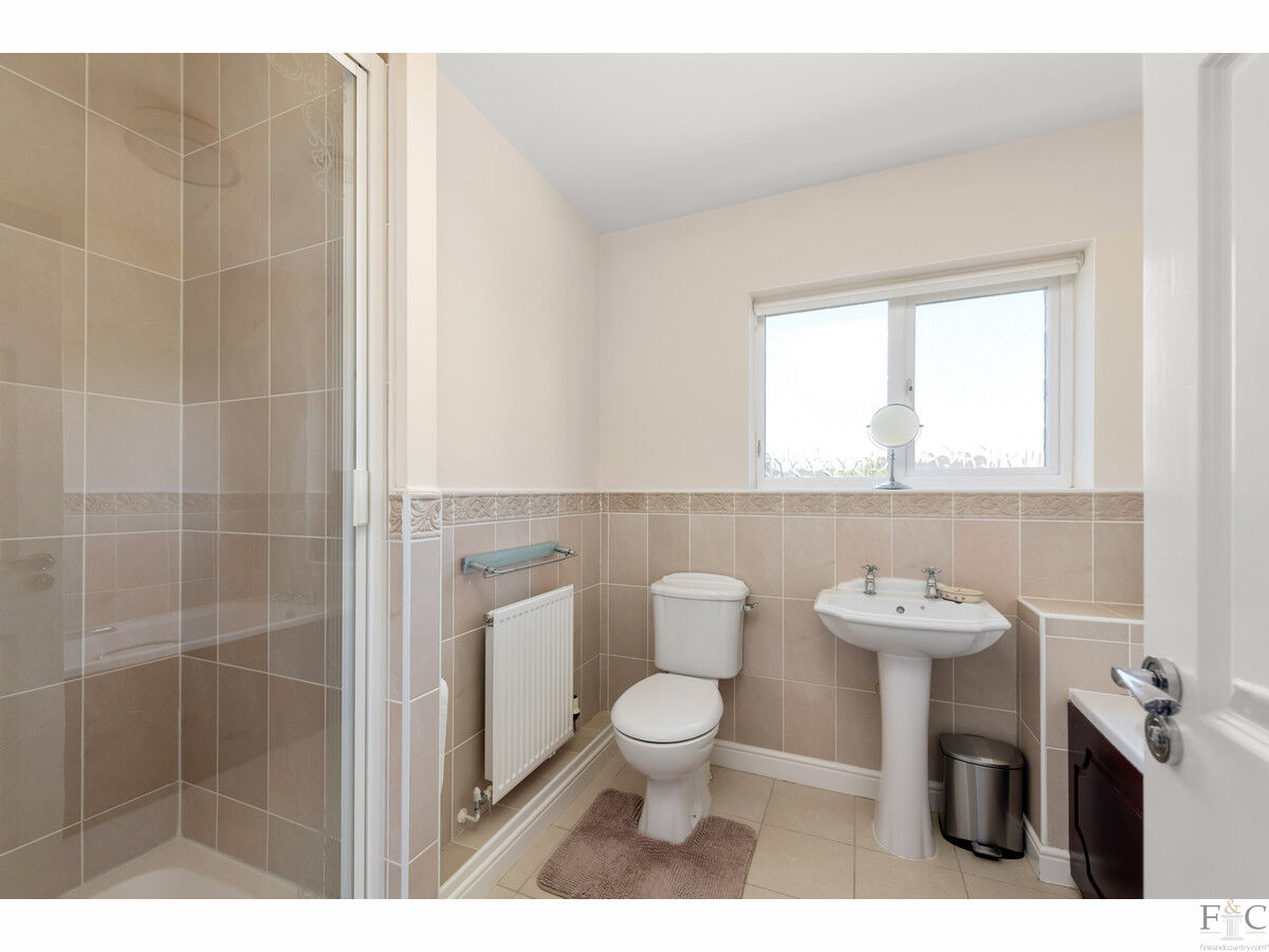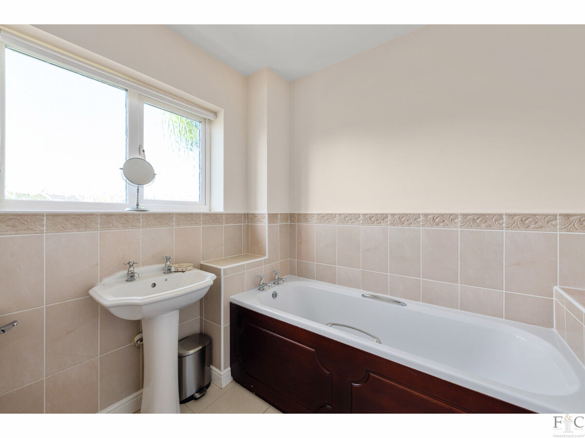 Spanning the width of the property, the spacious master bedroom suite has windows overlooking the drive and the garden. Consisting of a double bedroom, fitted dressing room and ensuite, this is a luxurious feature of the house. Likewise, bedroom two has an ensuite, while bedrooms three and four are opposite the family bathroom, with views to the front. All the bedrooms are fully carpeted in a matching scheme, characteristically fresh and spacious having been decorated last year, with additional fitted wardrobes in bedrooms two and three.