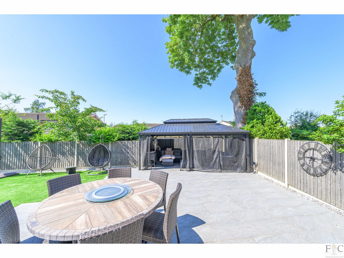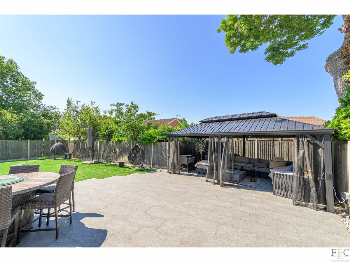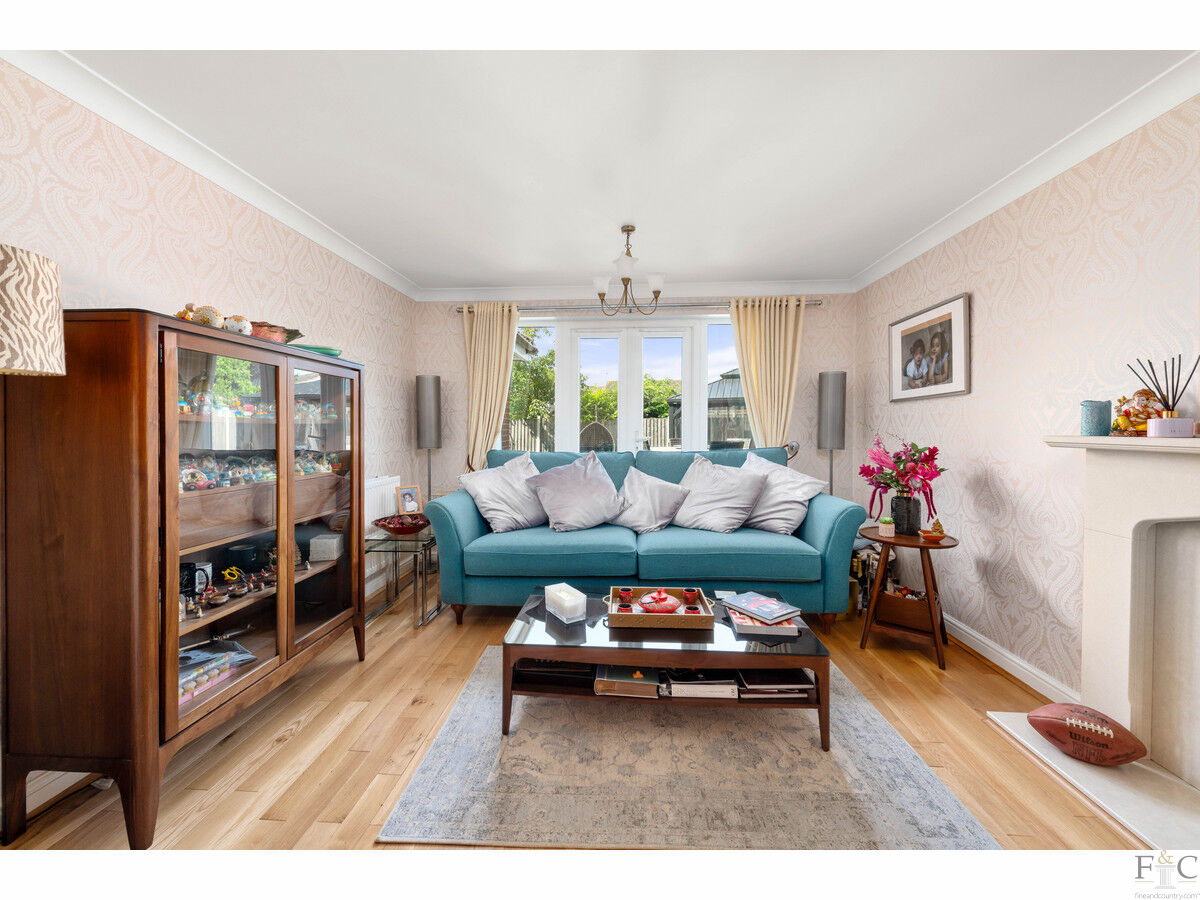 Lastly, the lounge. This elegant reception room has a white marble fireplace and hearth, hardwood flooring and a further set of patio doors that open into the rear garden. It is therefore, very easy to step across the patio to reach the kitchen diner or lounge. By means of two sets of patio doors, house and garden are linked beautifully to maximise their use.