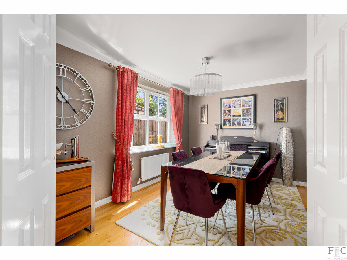 The dining room is at the front of the property and overlooks the drive. It features the same interior design qualities as the hall and allows for entertaining on a cosier but formal scale. This room has double doors and is within a few steps of the kitchen diner. The fitted carpets, curtains and light fittings throughout the house are included within the sale.