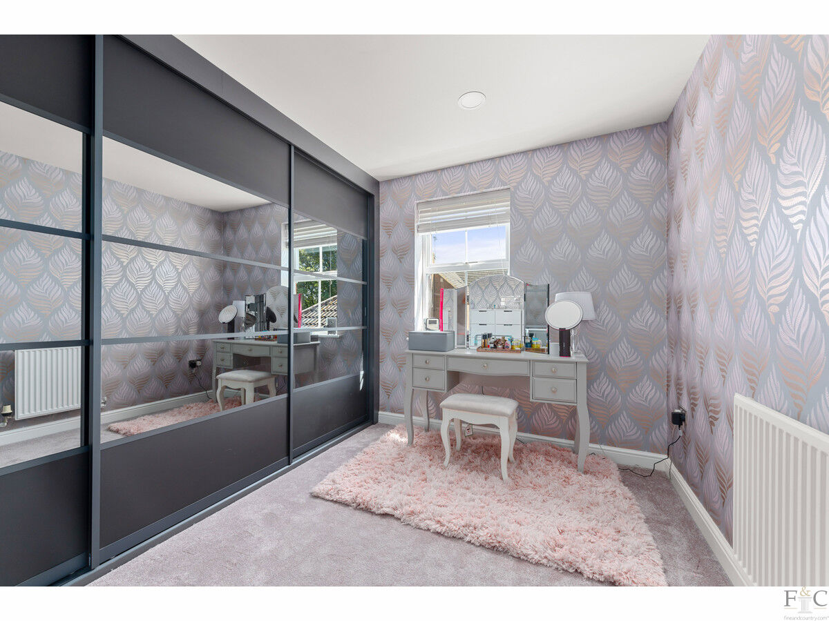 From the kitchen diner, the hall can be crossed once again where there are two remaining doors. One of them is a convenient home office that has been fitted by Sharps and overlooks the drive. Ideally positioned, it provides the ideal location for quiet study.
