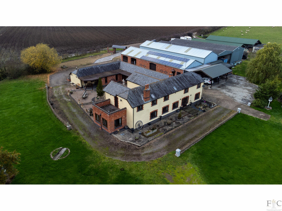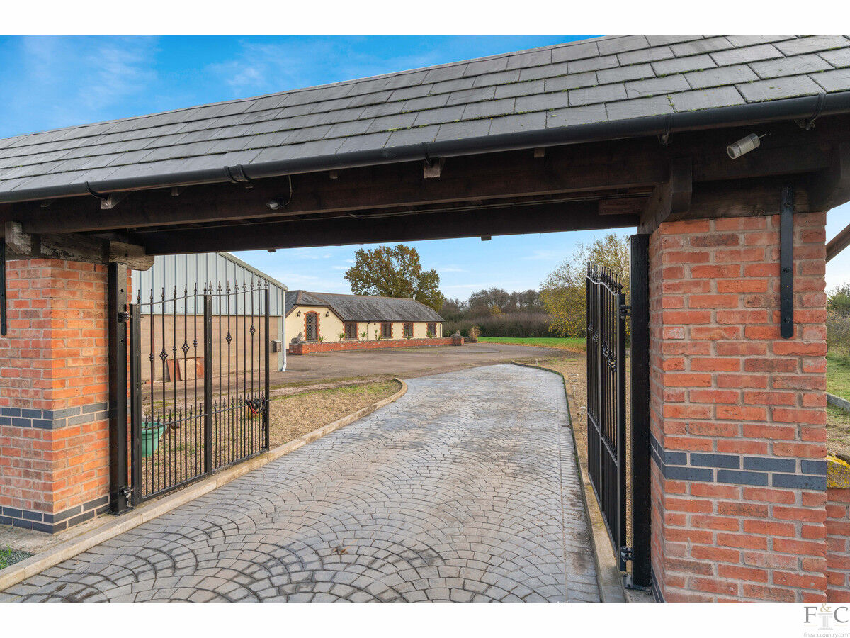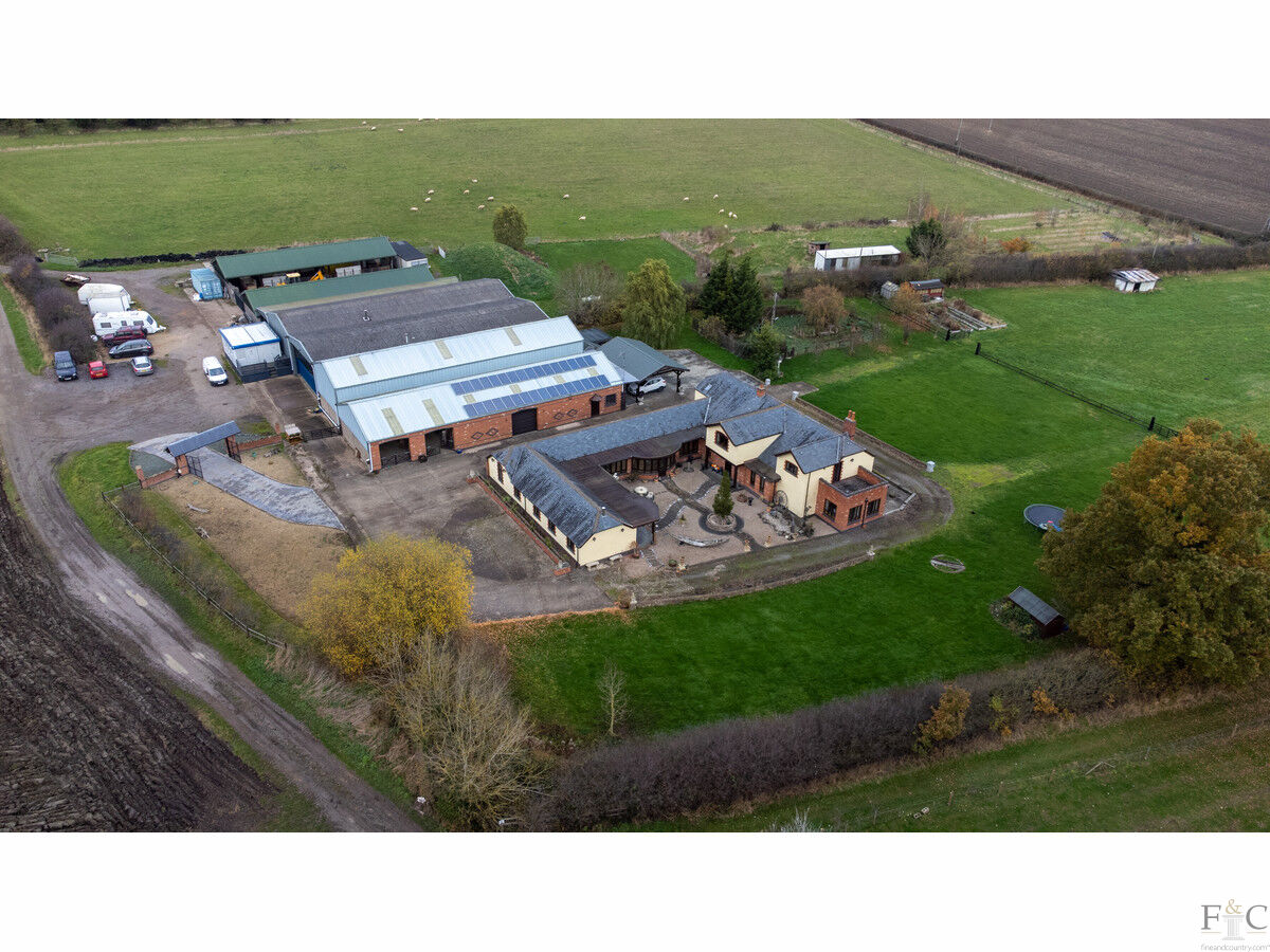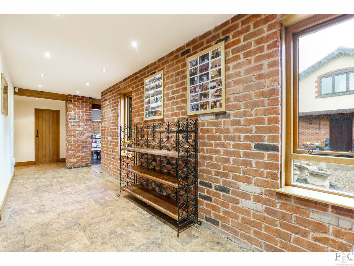 The private lane leading to the property ensures a sense of privacy and seclusion, even though you’re only a few minutes from the village centre. Two entrance points reveal a substantial parking area fringing a large multi-zoned warehouse and two barns, which extend behind the horseshoe-shaped farmhouse.