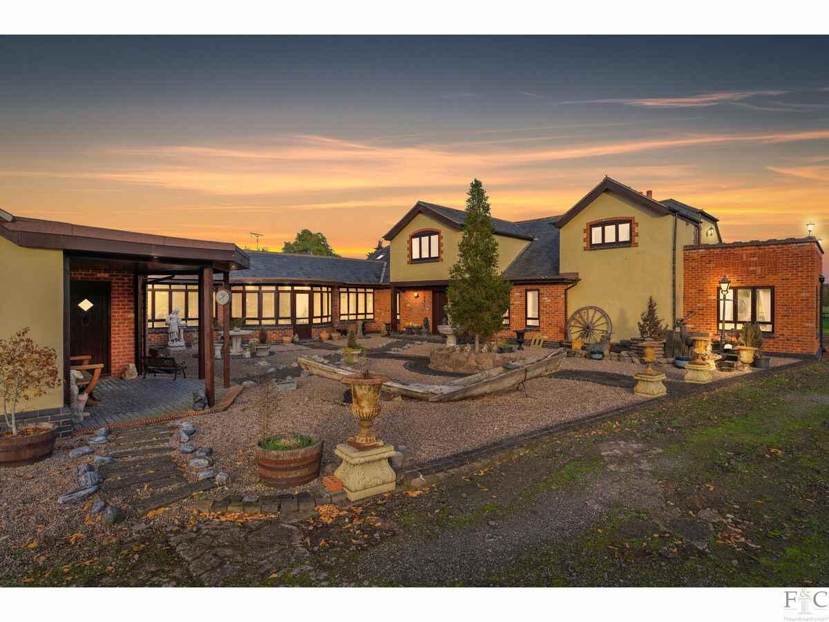 What would you do with a five-bedroom converted farmhouse with an impressive 28 acres of land complete with warehouses and stable complex? Featuring two balcony suites with three additional bathrooms, two kitchens and receptions, an office and study, and bundles of country character, your dream of owning a rambling rural idyll could finally come true. Outside, the generous acreage includes a lovely lake and four separate fields thronged with trees.