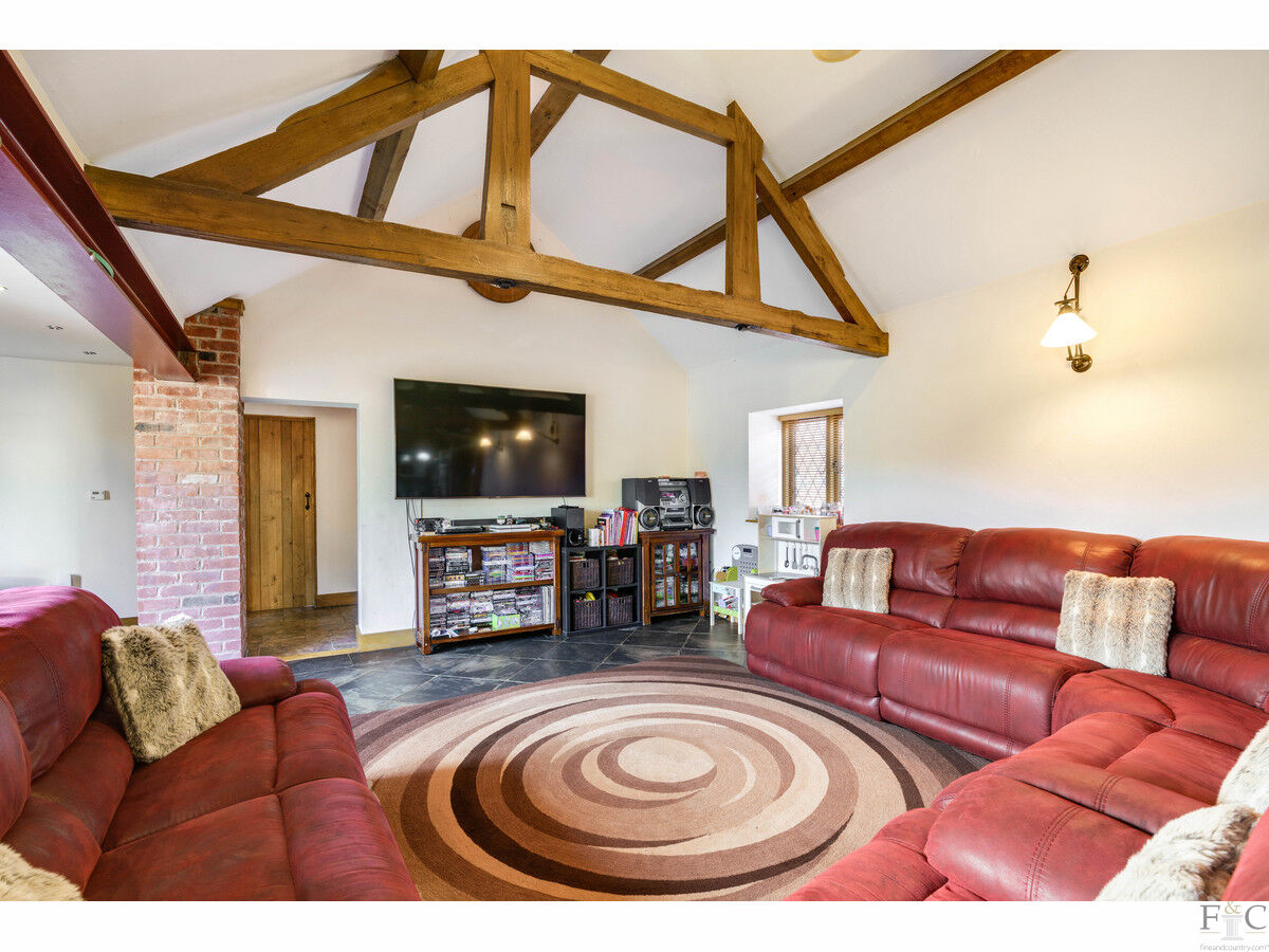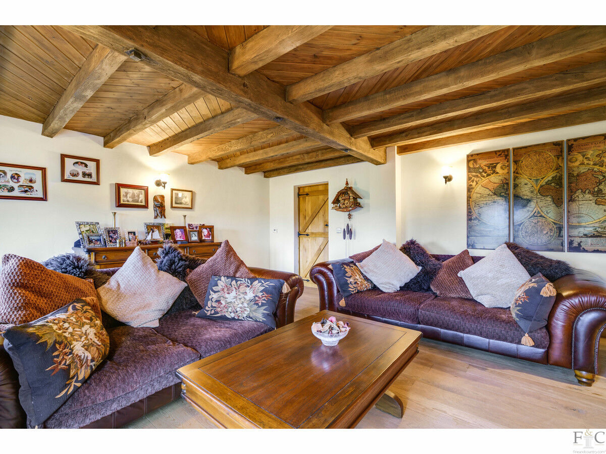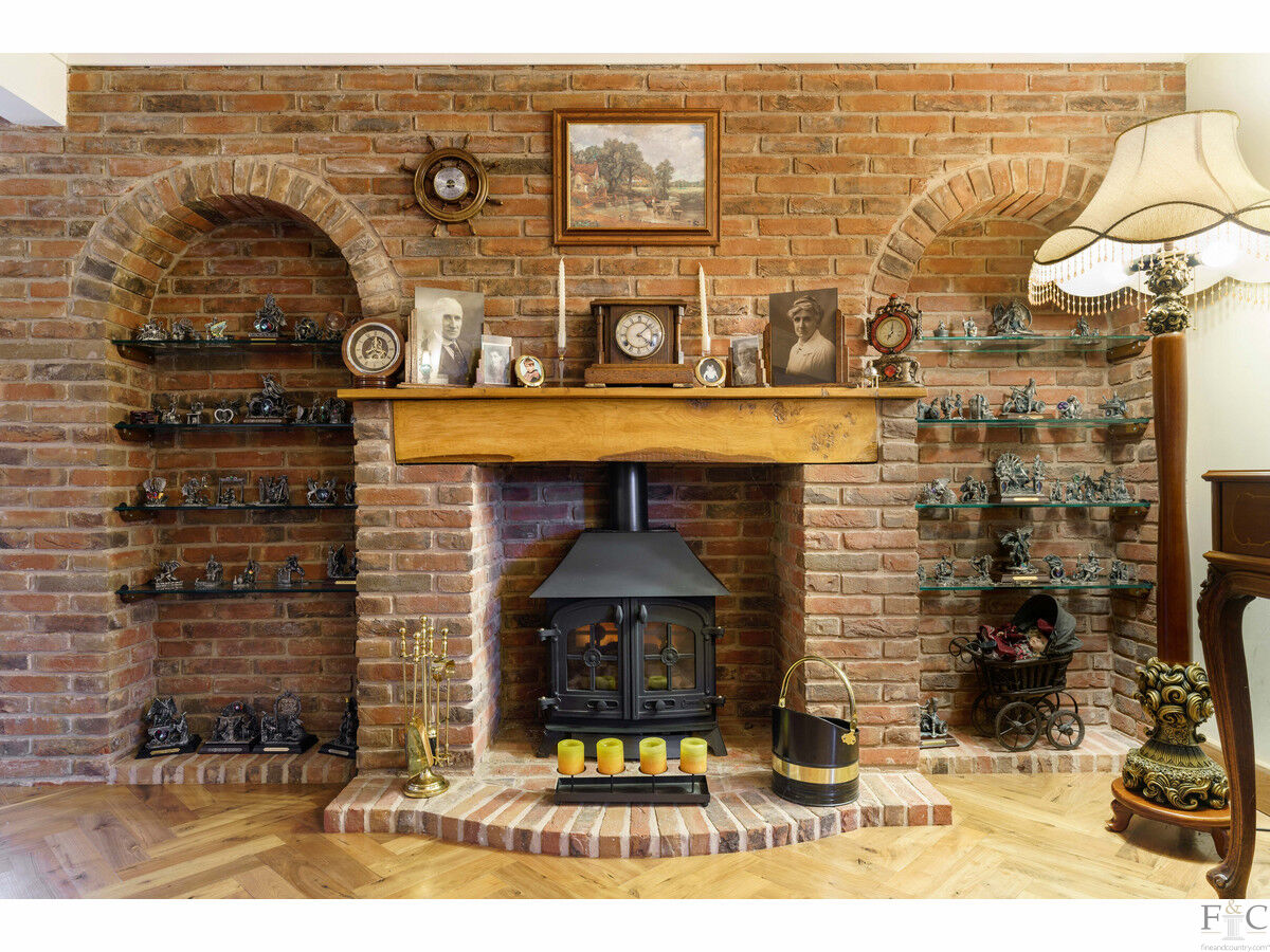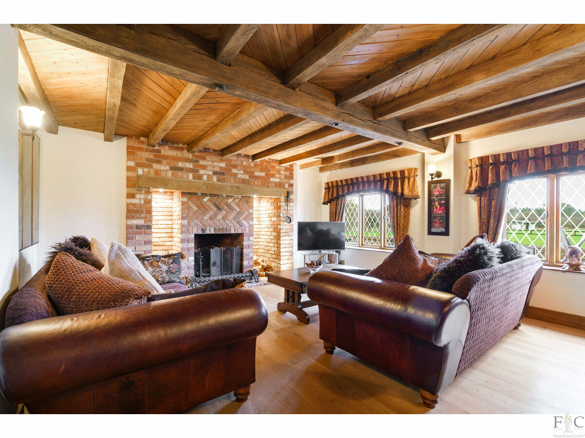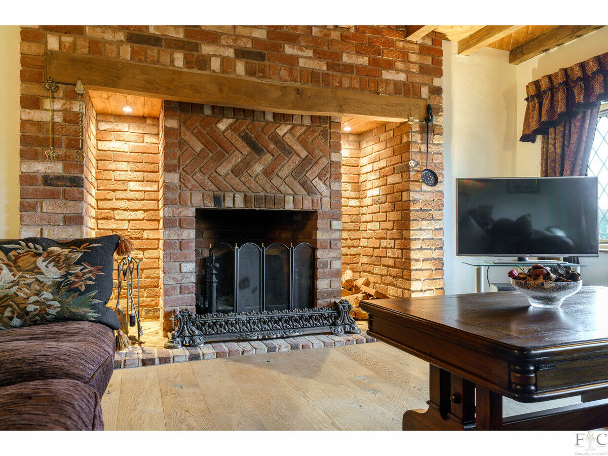 The warm and cosy character continues in the living room ahead. From the latticed casement windows overlooking the garden and warm lighting to the herringbone ceiling complementing a striking brick inglenook fireplace and solid oak floorboards, this wonderful reception has it all.