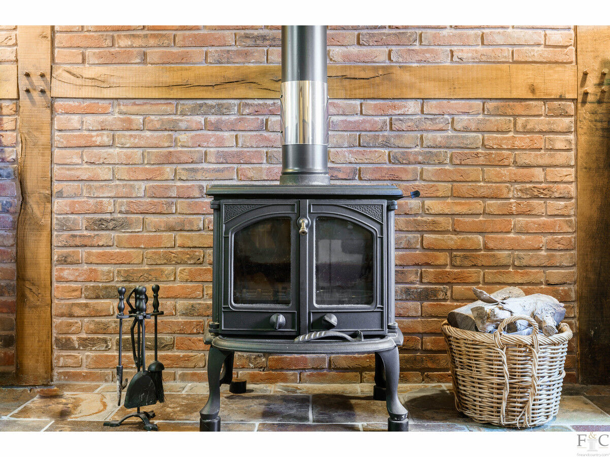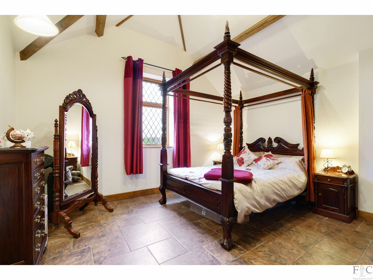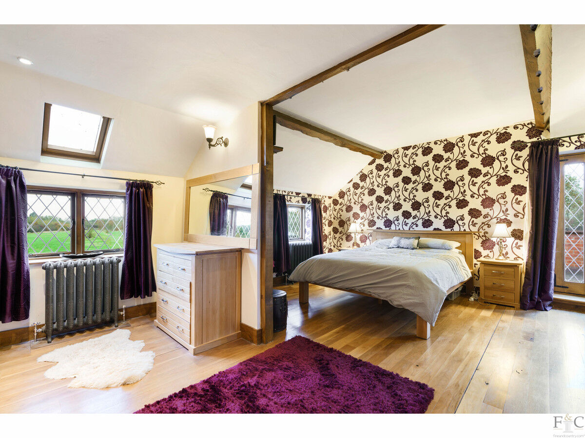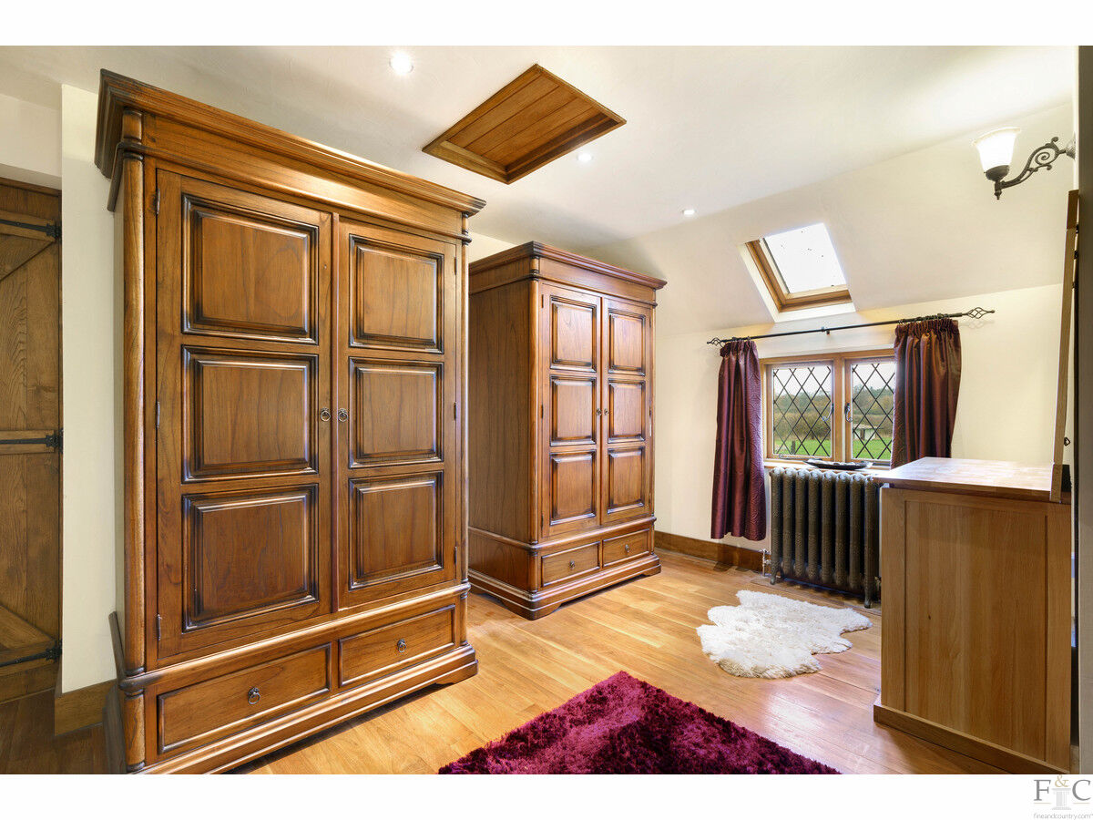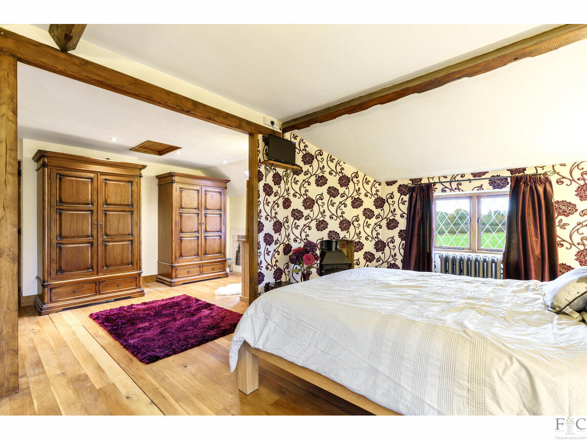Upstairs, an inviting galleried landing with a plush carpet leads straight into a fabulous master suite. Wooden walnut floorboards, beams and iron latches, latticed windows with traditional radiators beneath and matching balcony doors promote a snug, old-world atmosphere. A gas stove at the foot of the bed seals the deal.