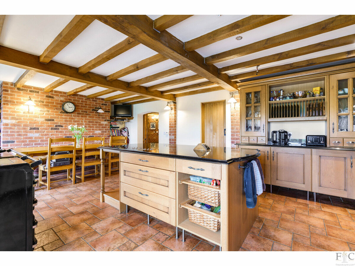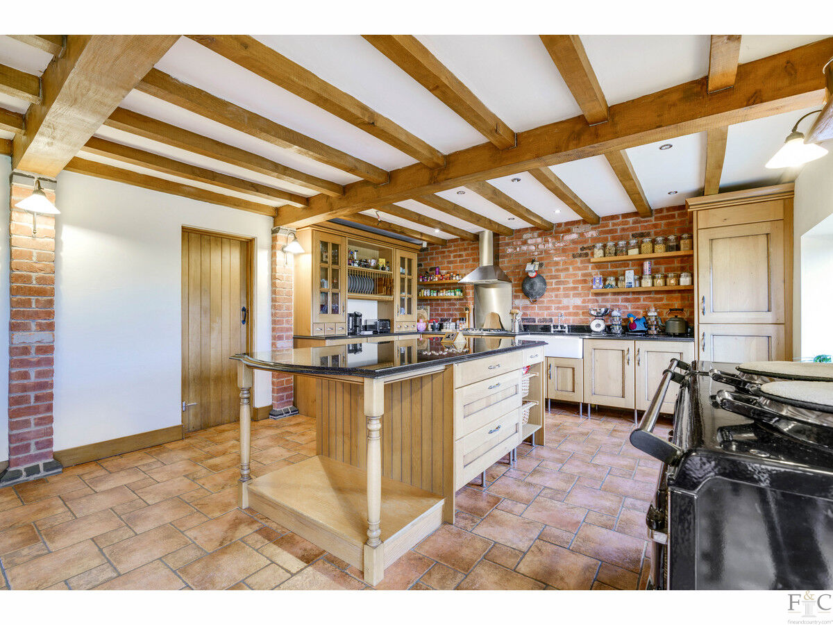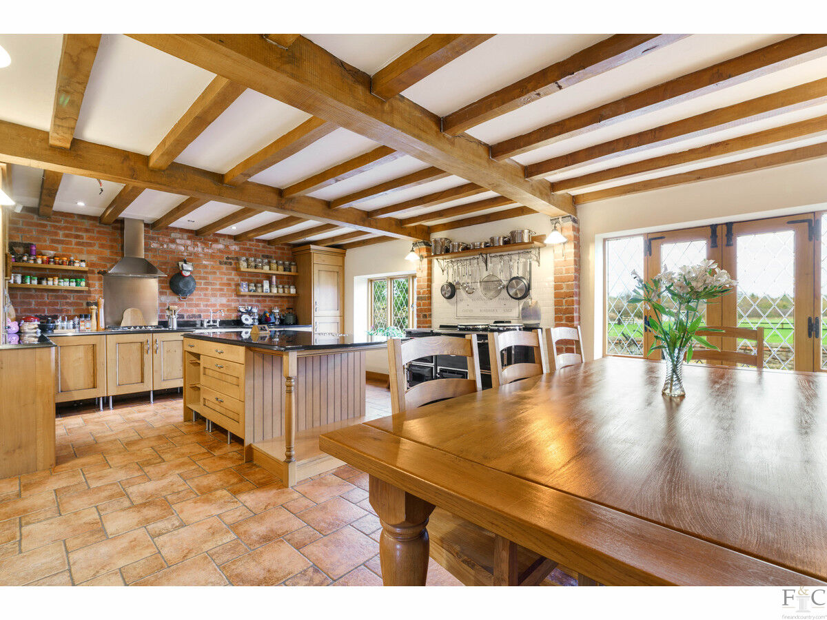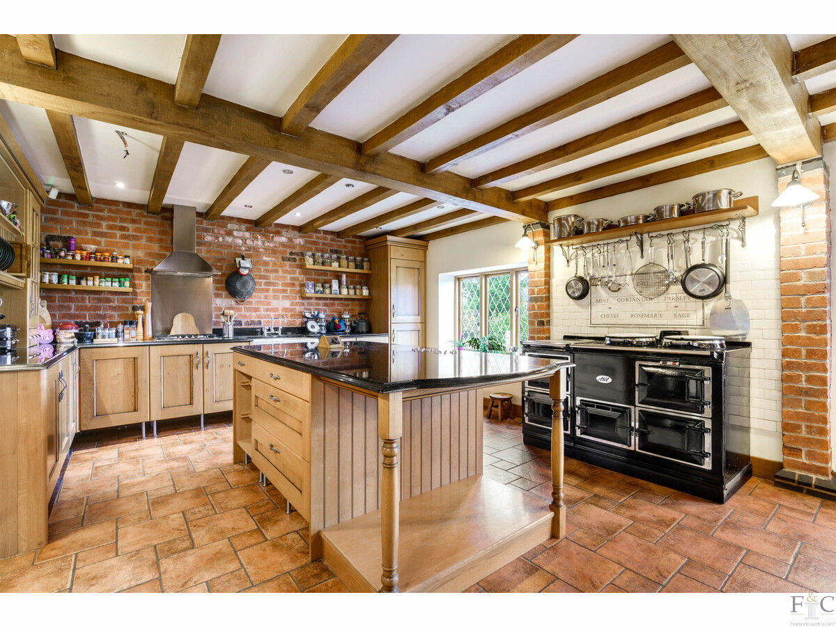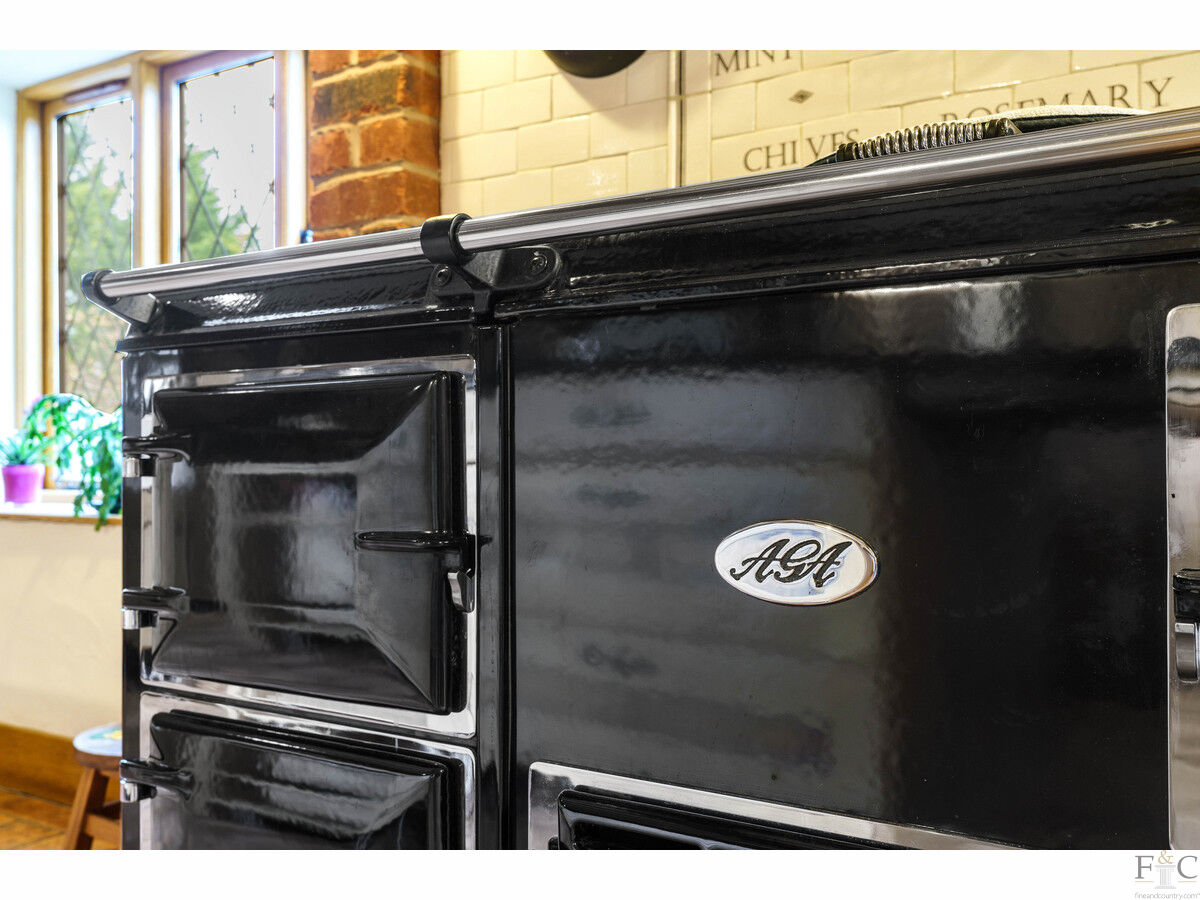 Return to the hallway to discover a dining kitchen that epitomises country living, from its tiled flooring and exposed brickwork to an exposed oak beamed ceiling dotted with downlights. Latticed windows and matching double doors on the far wall frame the garden and flank a shiny black and chrome special edition AGA with a white metro-tiled splashback.