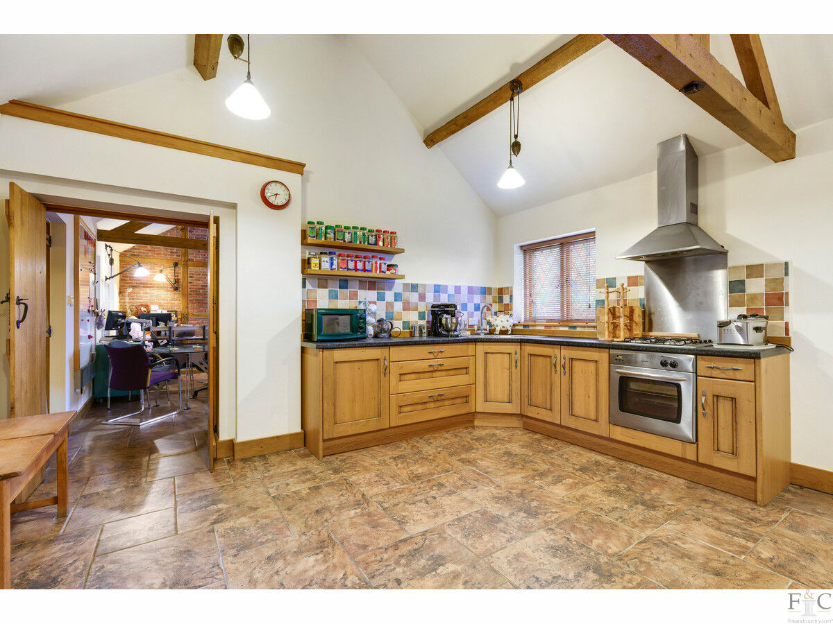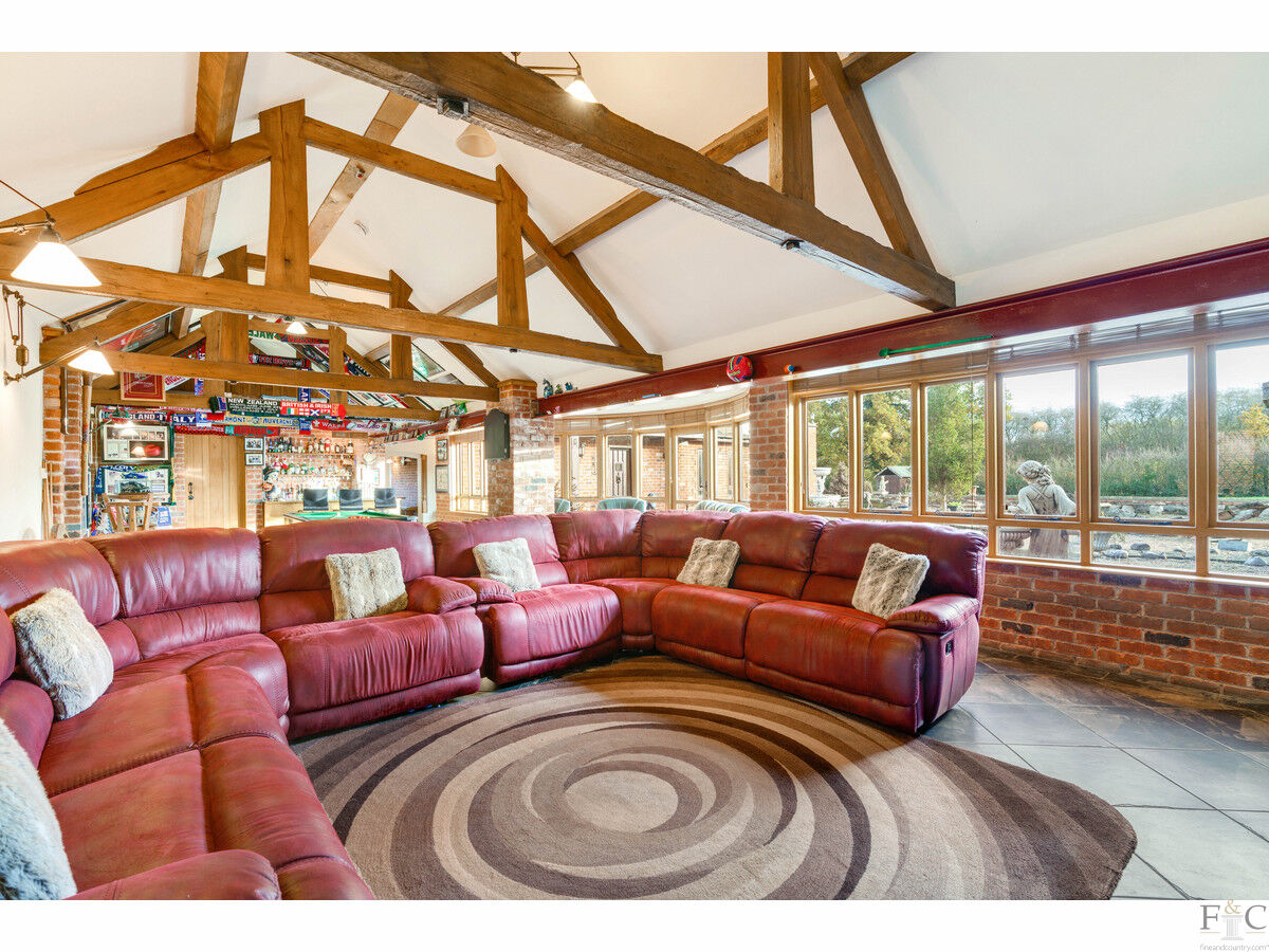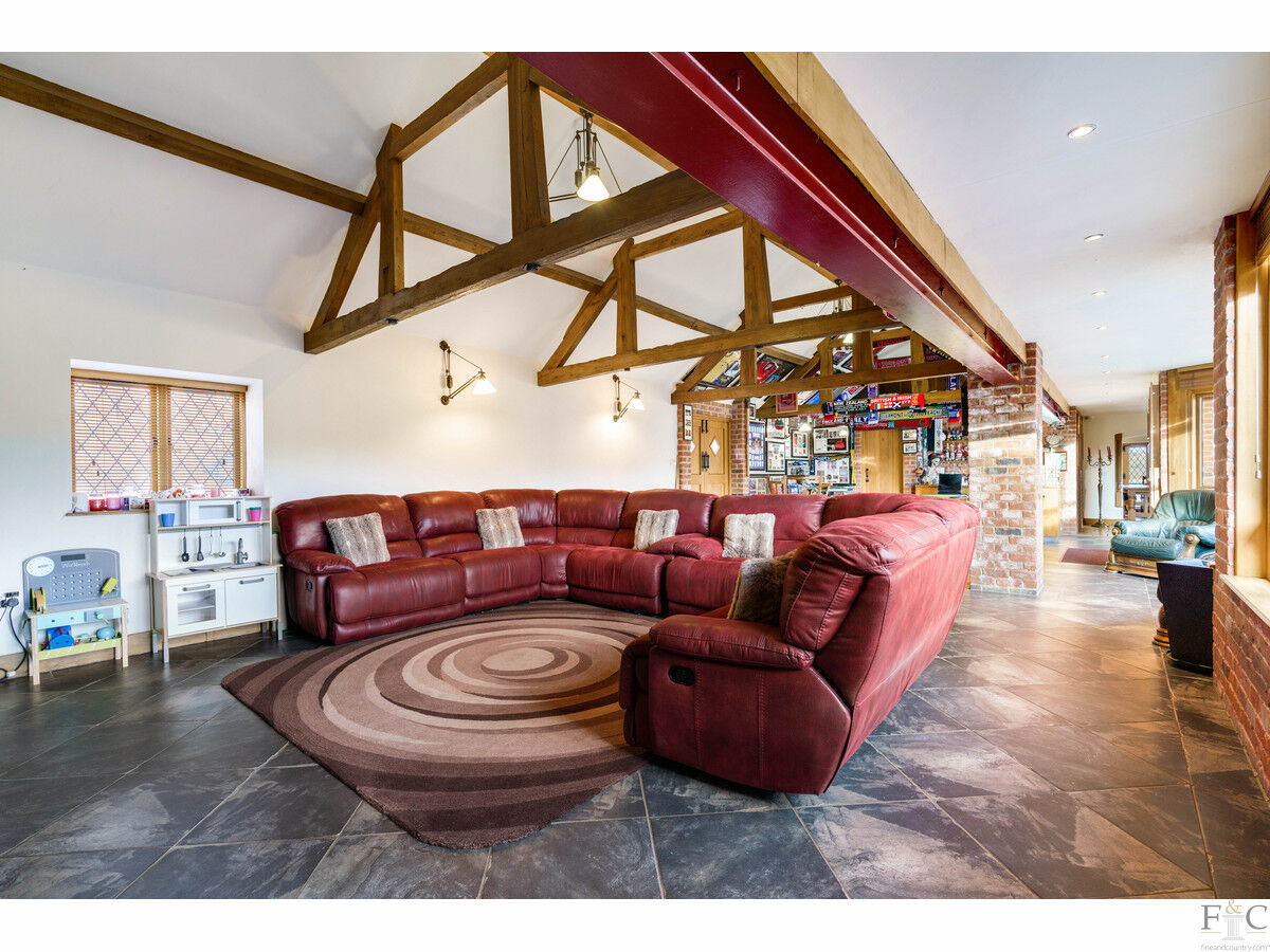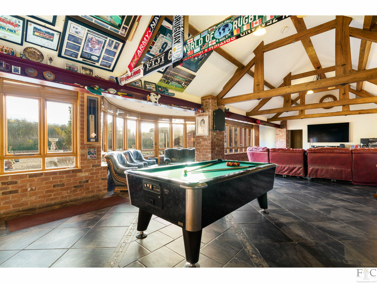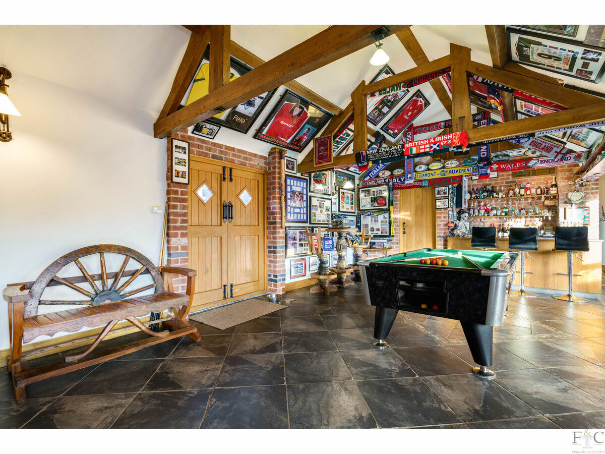 Vaulted beamed ceilings also add to the sense of airiness, while diagonally laid stone tiles extend towards a private bar. With access to the rear garden and enough room to whip up a drink, play pool and watch films on a wall-mounted TV, there’s nowhere better to host parties and gatherings whatever the weather.
