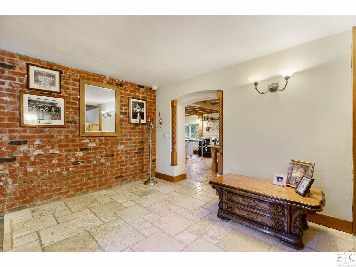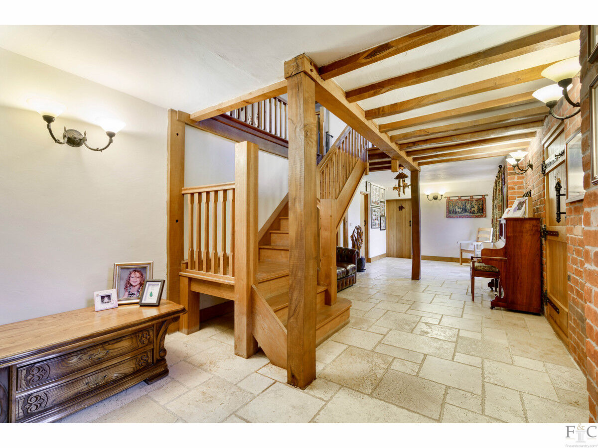 You can access the left wing from the block-paved covered patio that doubles as a handy porch area. But for now, head across the courtyard to the main entrance, where a traditional front door opens into a large, contemporary hallway with exposed beams and brickwork, stone floor tiles and a central turning oak staircase.