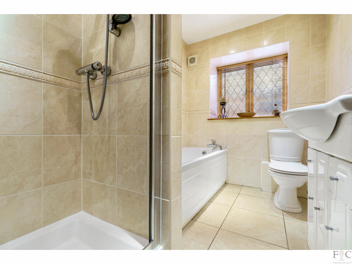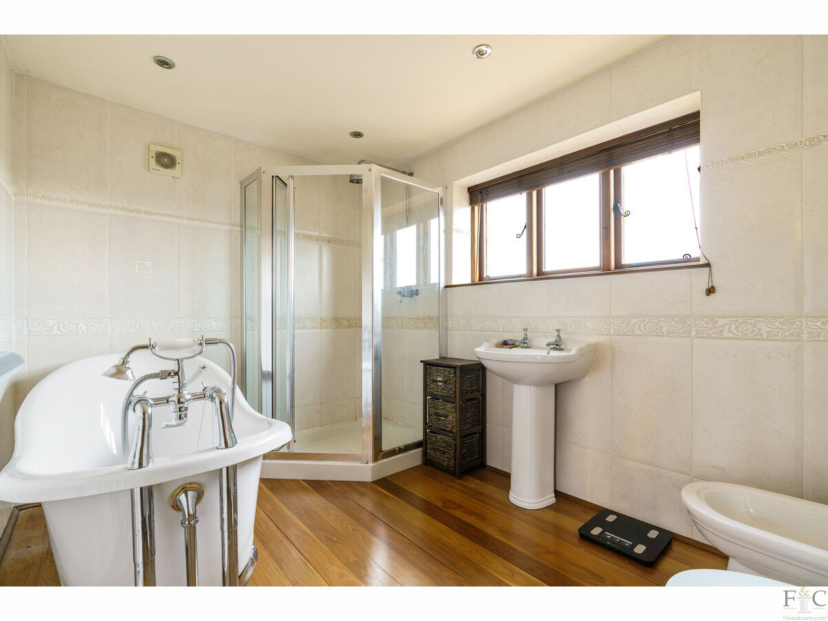 Meanwhile, tastefully eye-catching feature wallpaper and crisp paintwork inject a chic modern feel that sets the tone for romantic evening drinks on the walled balcony. In the five-piece en suite, the luxury peaks in the form of a freestanding roll-top bath and a rainfall shower enclosure.