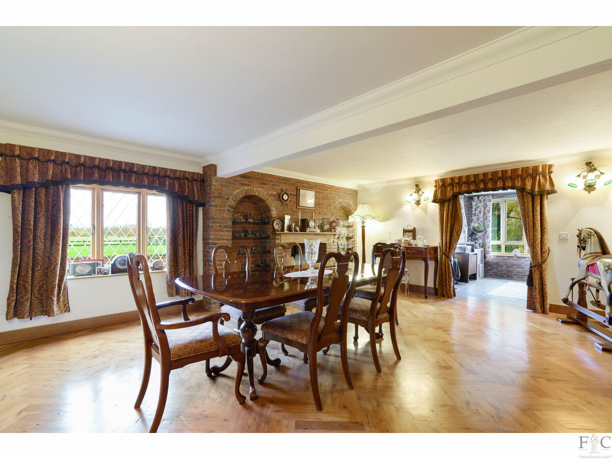 When filled with your treasured ornaments and books, the plethora of solid wood and glass shelving will create a personalised backdrop to dinner parties and family gatherings. Take a glimpse over the fields from another latticed window before arriving in a triple-aspect study – accessed via a walkthrough.