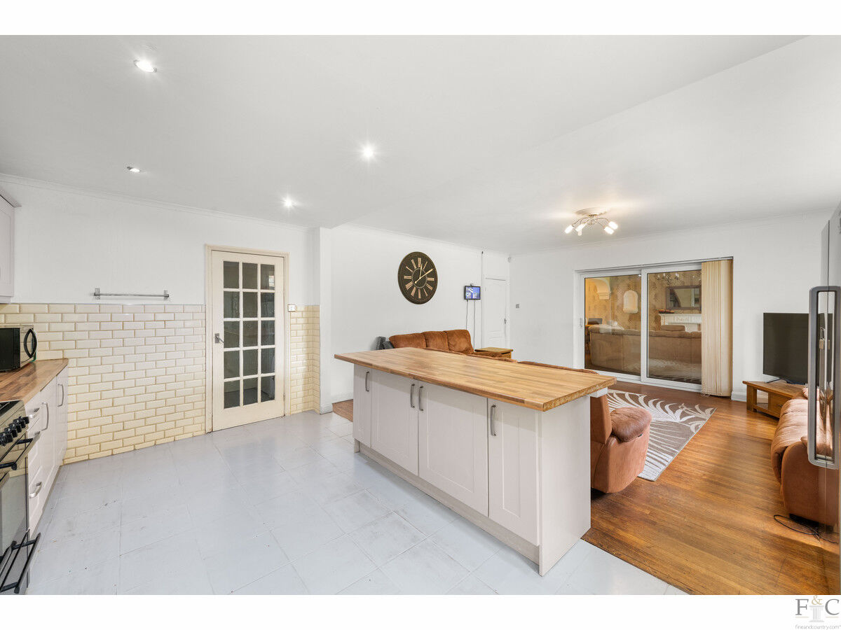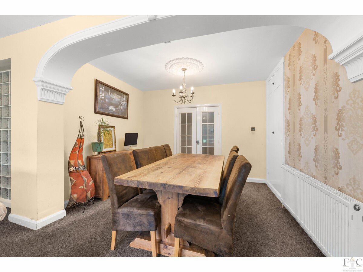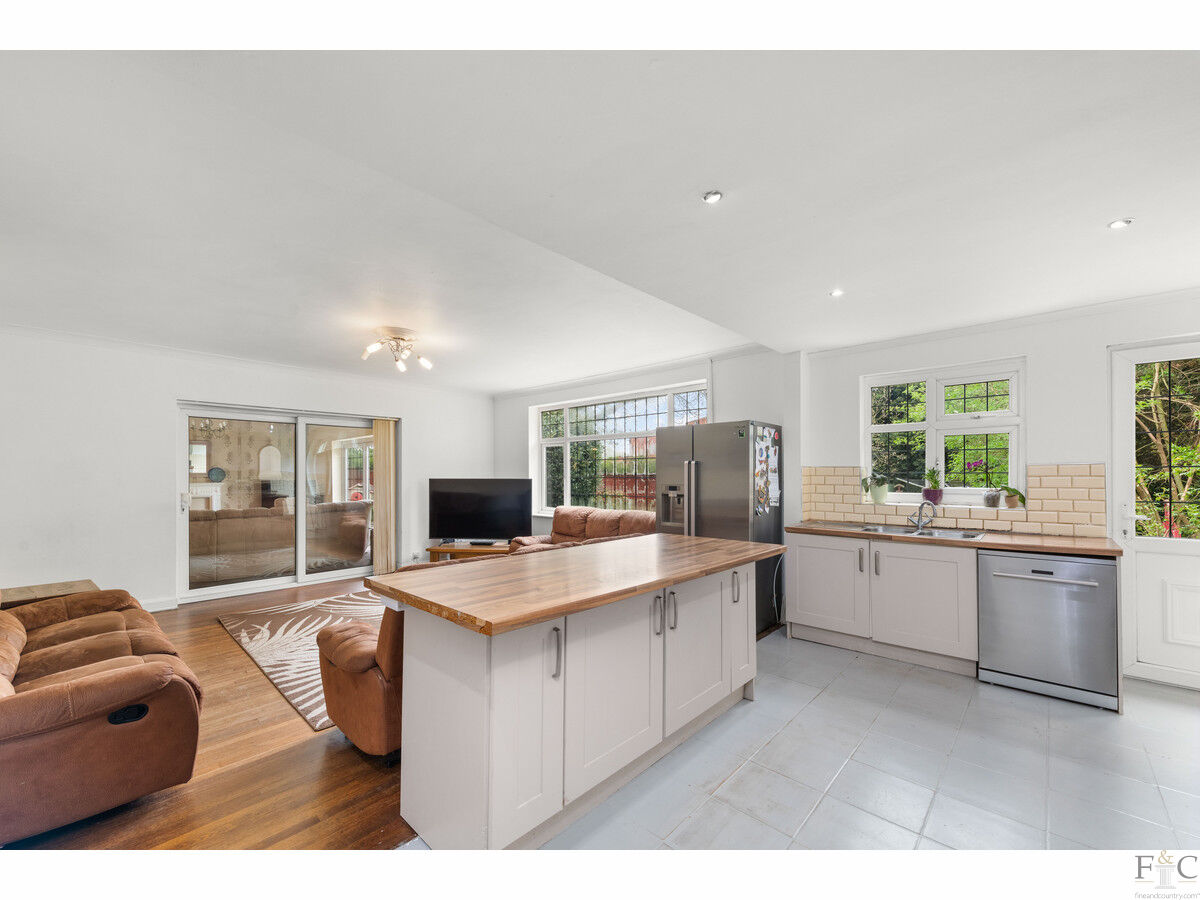 The open plan lounge/dining room has large, fully glazed patio doors opening onto an outside patio area and the well-maintained south-facing garden. There is a feeling of elegance and space in this room due to its open plan nature, cosy fireplace and generous natural light spilling through those french doors and the internal ones– and everyone can be kept an eye on with ease.