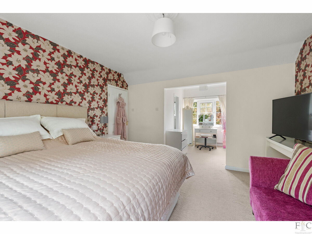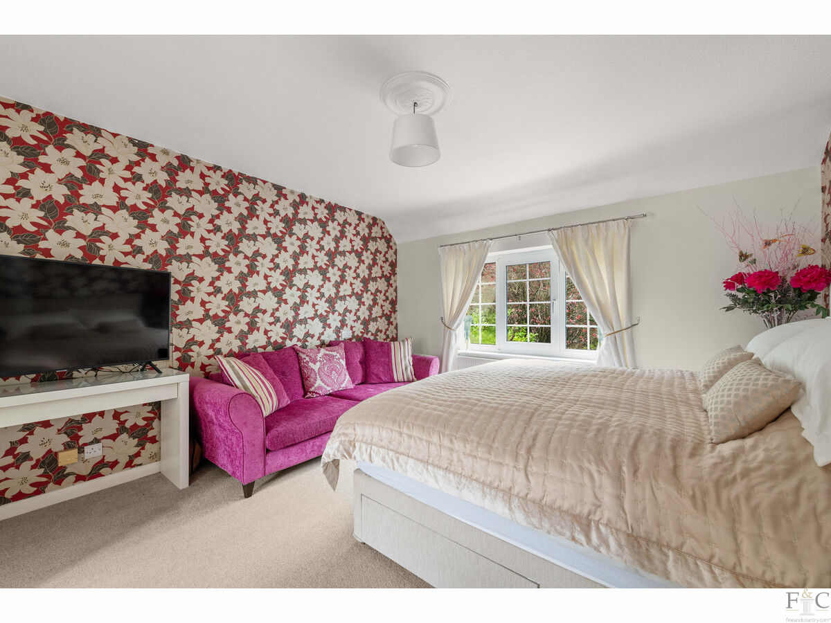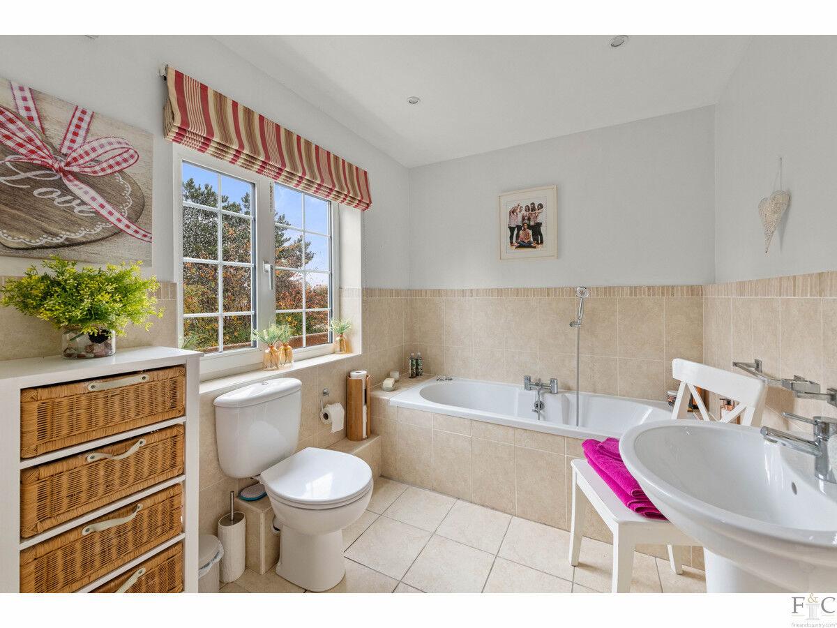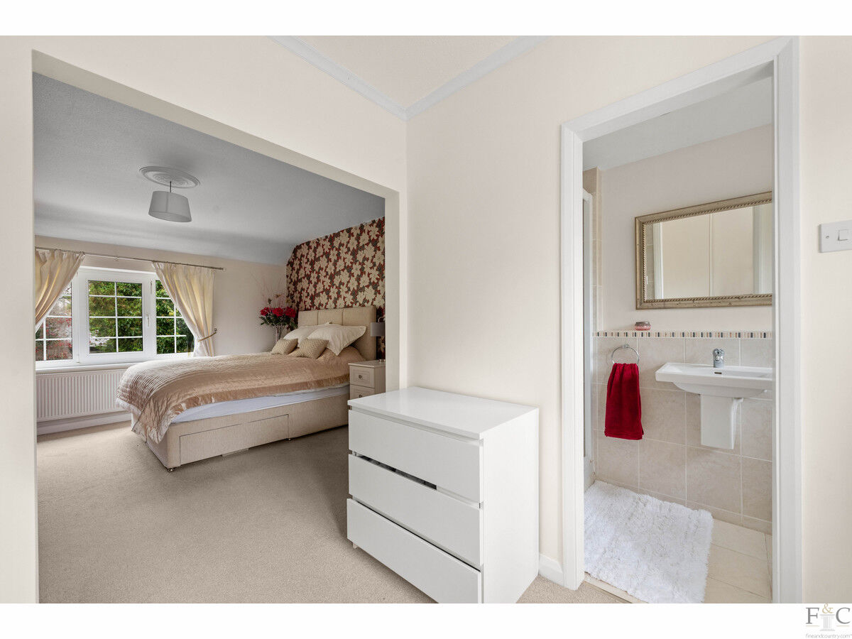 By entry into this hallway, the ground floor bedroom is on the right and has a canted bay window looking to the front of the house, with inbuilt wardrobes and a shower room consisting of white bathroom fixtures and tiling immediately next door. The bathing facilities throughout Fieldend have been fitted and maintained to a high standard, with modern features and appliances to cater for the occupants of a large, superior property.