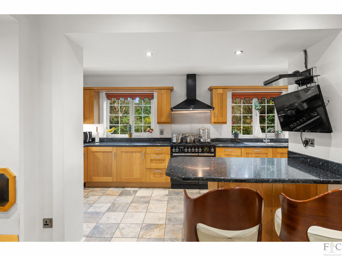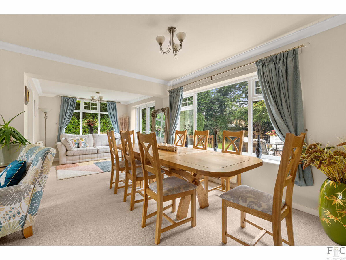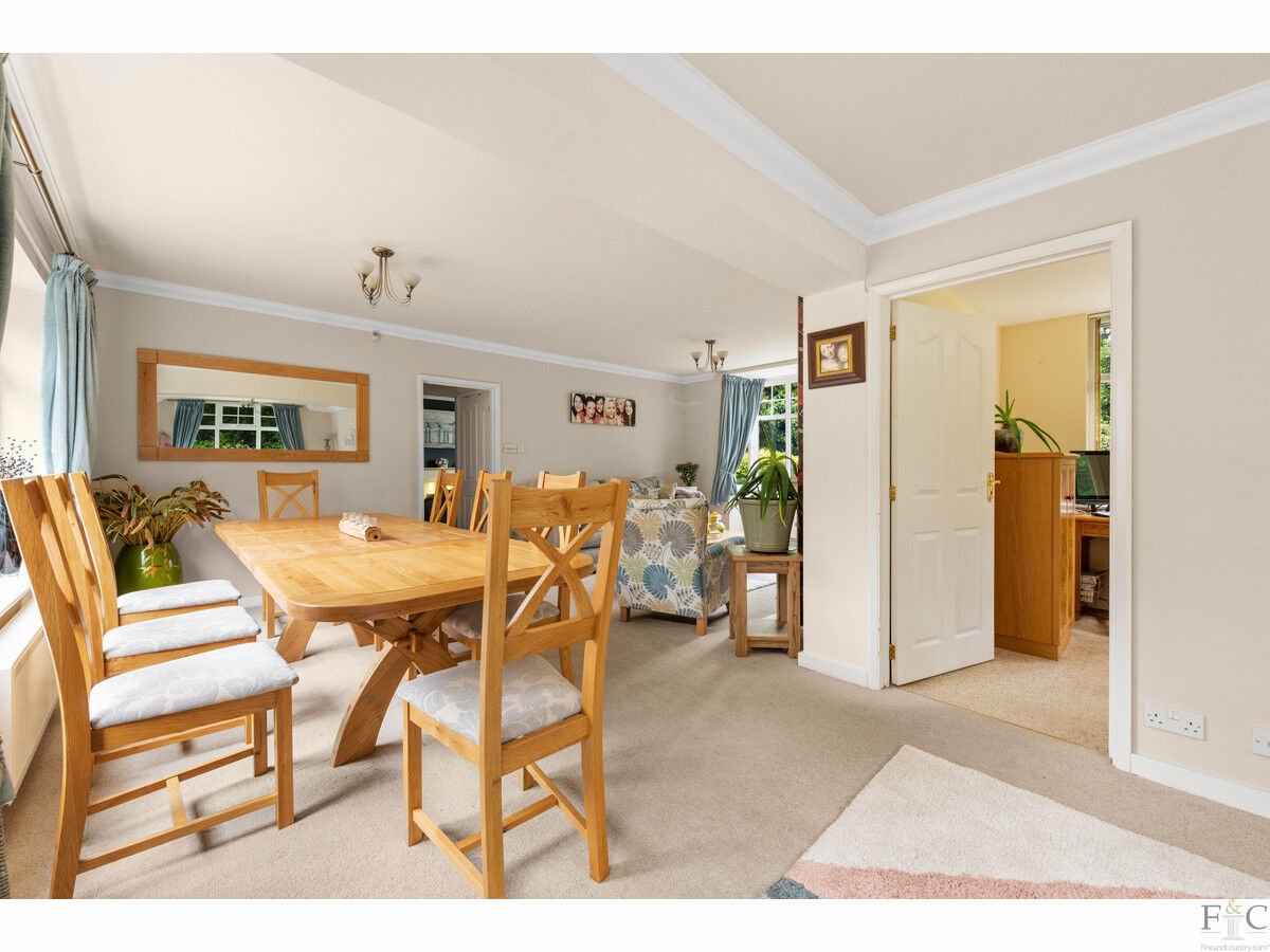 The lounge is a beautifully light room and has windows on three sides, plus the aforementioned patio doors. It is an L shaped room of generous proportions and furniture can be used with flexibility to designate specific areas for purpose. Presently, a dining room table permits views of the garden to be appreciated and a log burner on the central wall creates an inviting sitting area. It also has a light filled study room next door which has fitted desks and overlooks the front of the house.