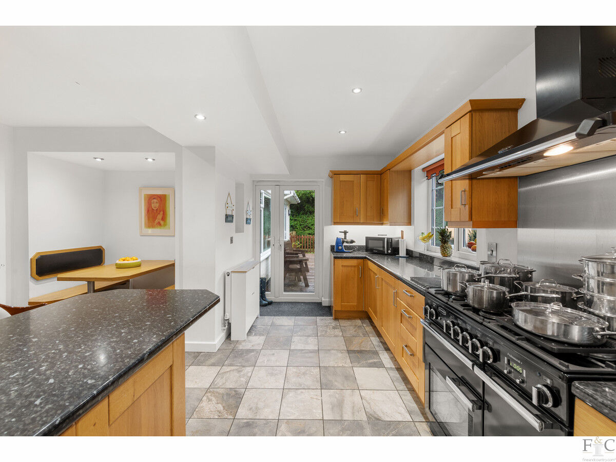 The kitchen is equipped with a double oven and extractor fan, fridge freezer and swathe of work top space and storage. A utility room to the right is fitted with another sink and plumbing for laundry appliances. The kitchen overlooks the rear garden and has double doors opening onto a decked seating area, across which the lounge can be entered through another set of doors. This arrangement provides perfect accessibility for larger scale entertaining as guests can move from one area to another and benefit from the space afforded by the garden.