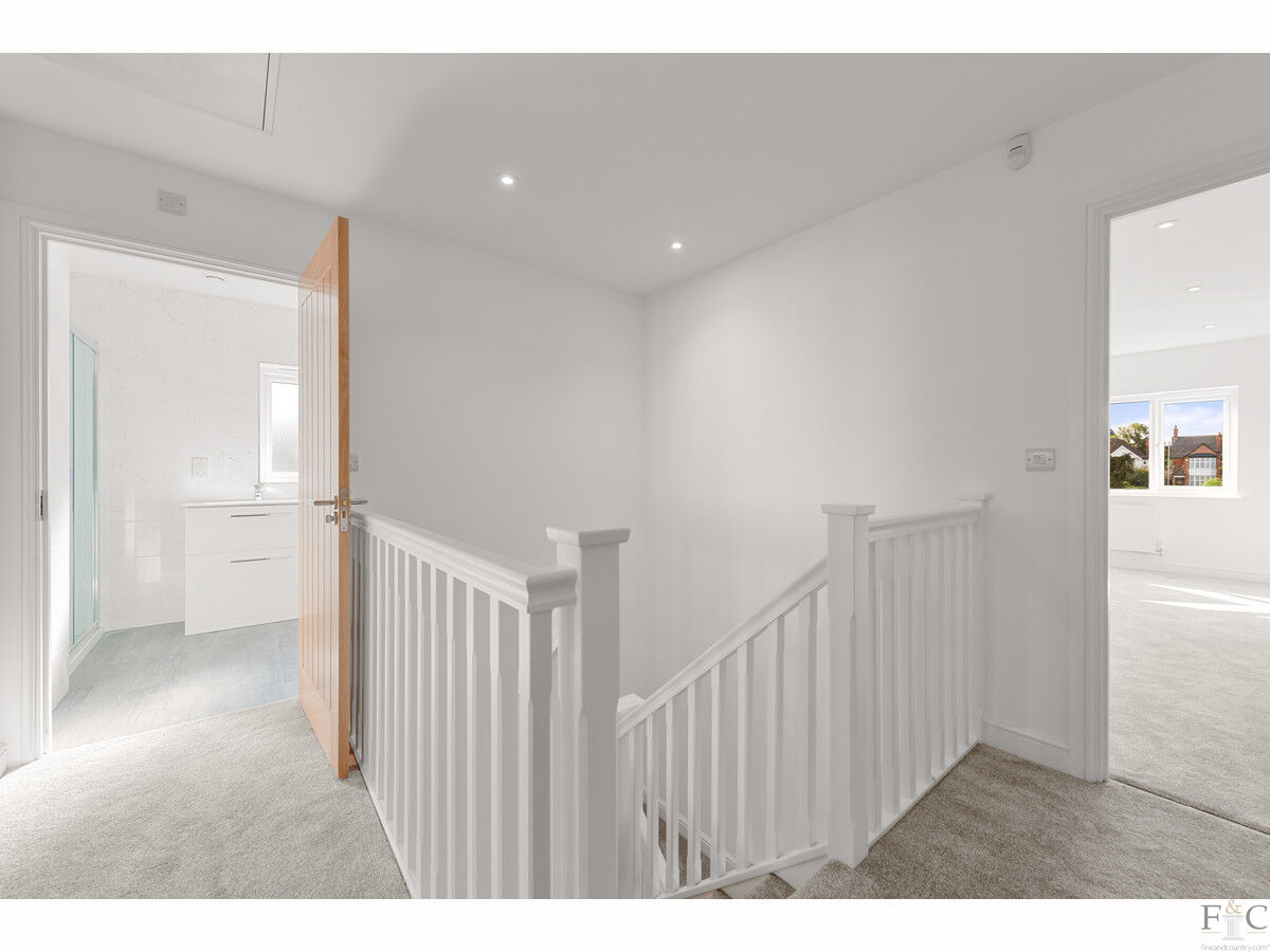 The upper level houses five spacious double rooms, each featuring cleverly designed integral wardrobes. The three largest bedrooms each have ensuite bathrooms fitted with high-end white sanitary ware and Grohe chrome fixtures, echoing the superior standards in the family bathroom.