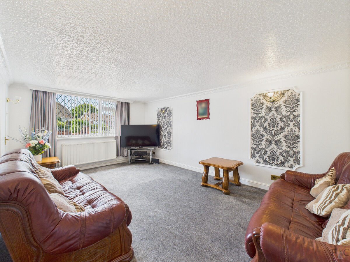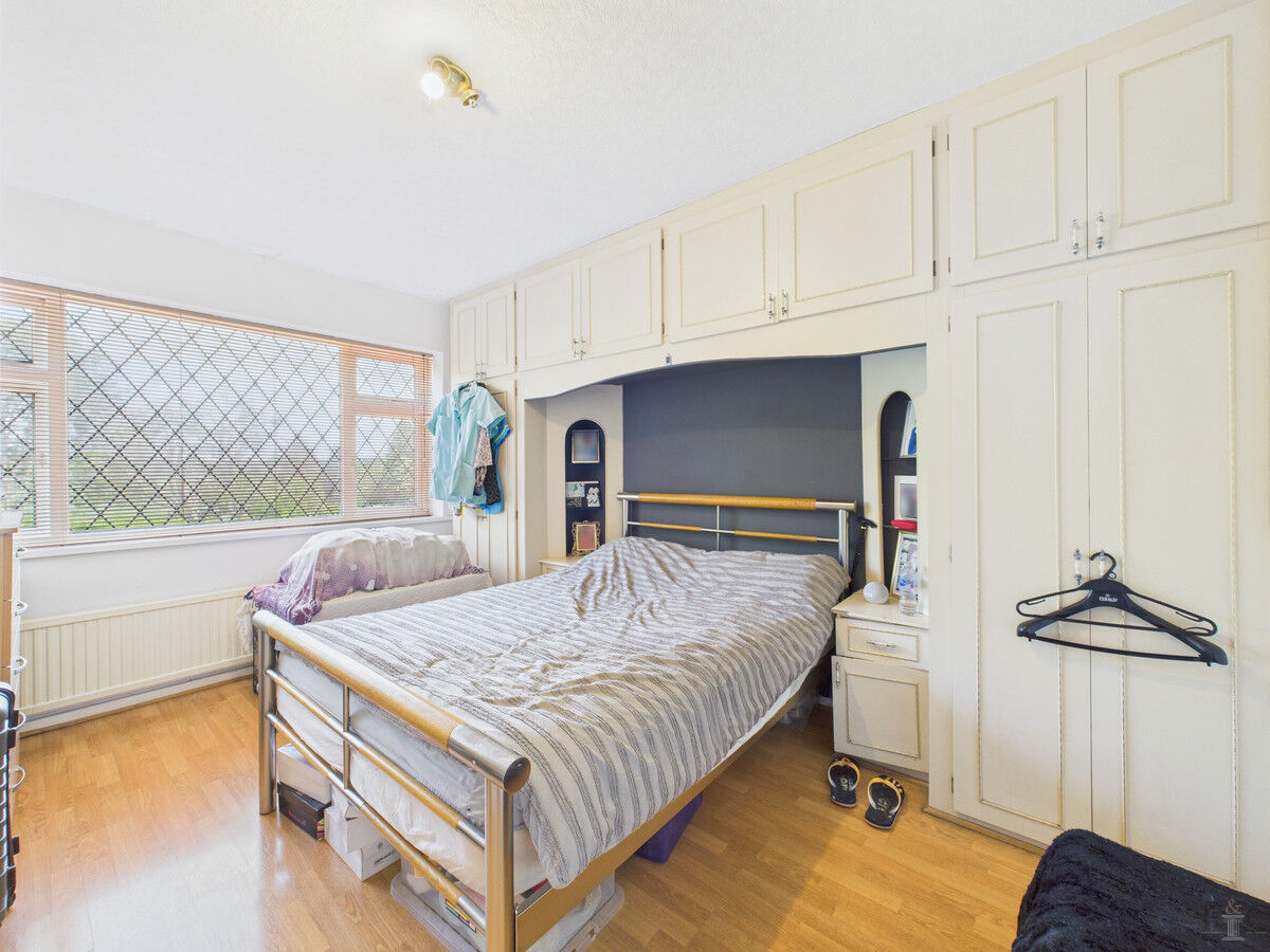 A third formal dining room lies beyond the hallway, with a window overlooking the beautifully landscaped rear garden and soft carpeted flooring, ideal for hosting dinner parties or Sunday lunches.