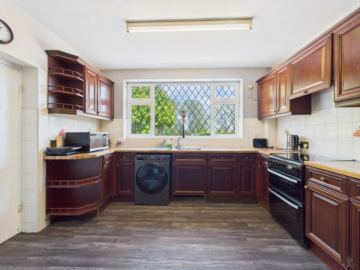 Also from the hallway is a pantry cupboard, and access to the generous open-plan kitchen, fitted with ample wall and base units, a freestanding cooker, and a breakfast bar for casual dining. The kitchen sink is perfectly positioned under a window offering views across the garden.