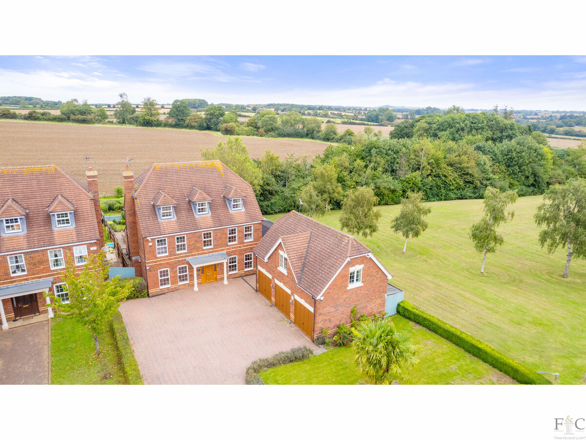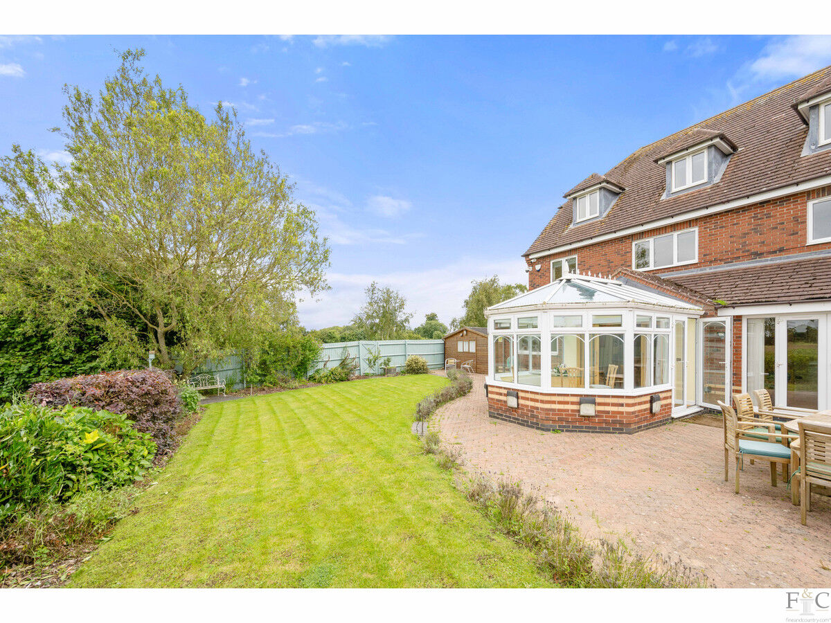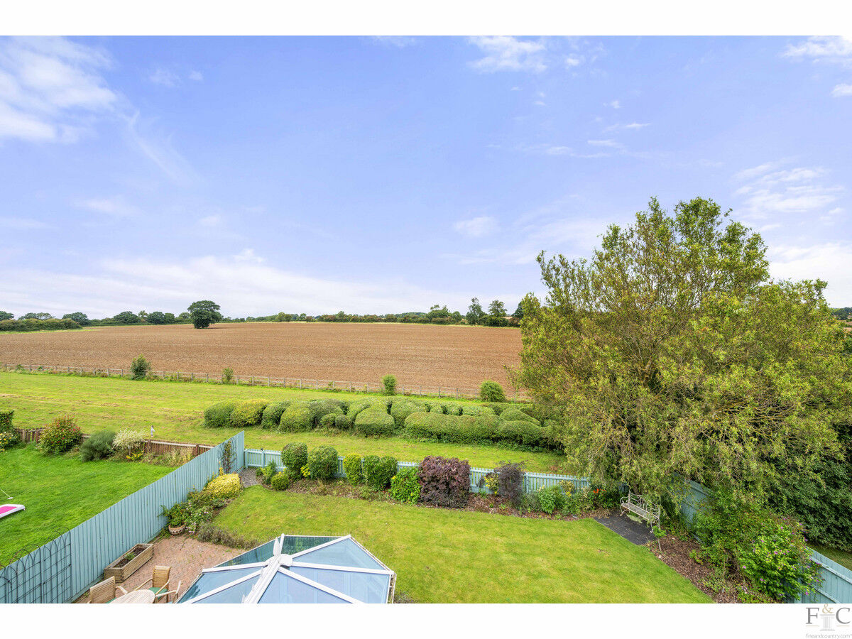 The rear garden is an ode to meticulous landscaping and planning. It offers a sophisticated blend of both patio and lawn areas that make for versatile outdoor living—whether it's alfresco dining you seek or simply a tranquil space to lounge and soak in nature's beauty. The garden faces south, enjoying a warm embrace in winter and a cool touch in the summer while offering glorious views of both sunrise and sunset. What's more, the property is blessed with breathtaking views over expansive fields that stretch as far as the eye can see. For those in need of extra storage or a workshop, a large shed is discreetly situated at the side of the property, proving that functionality and beauty can indeed coexist harmoniously.