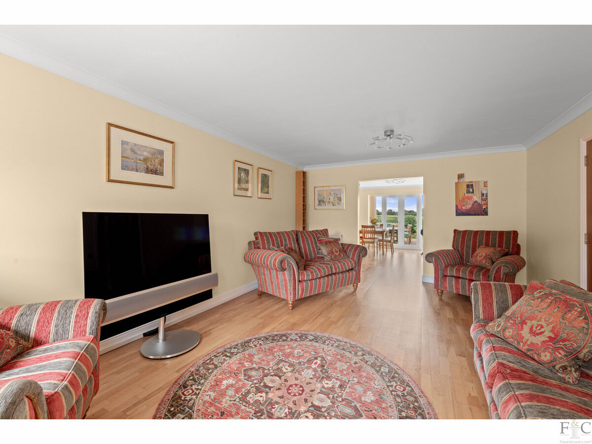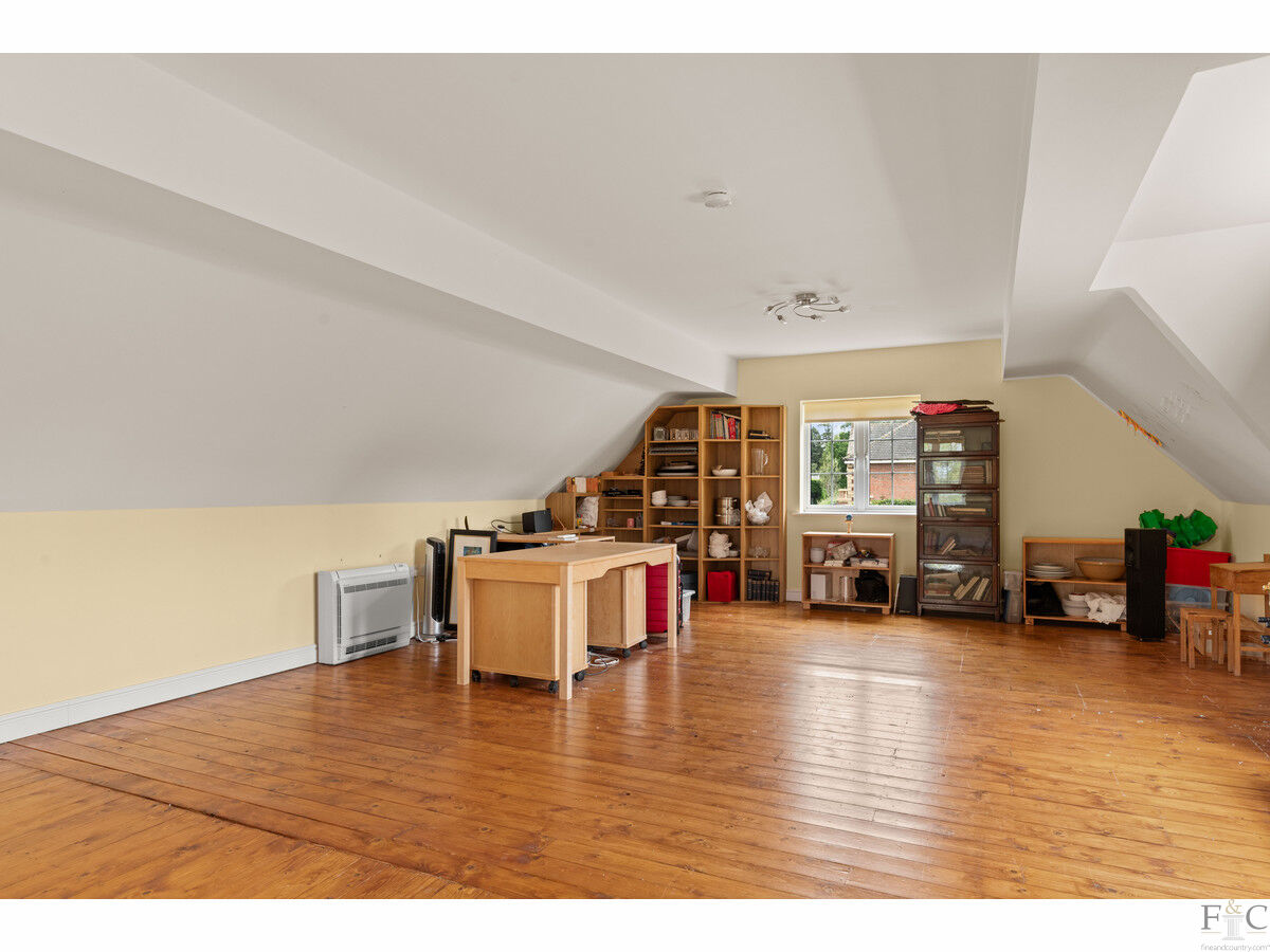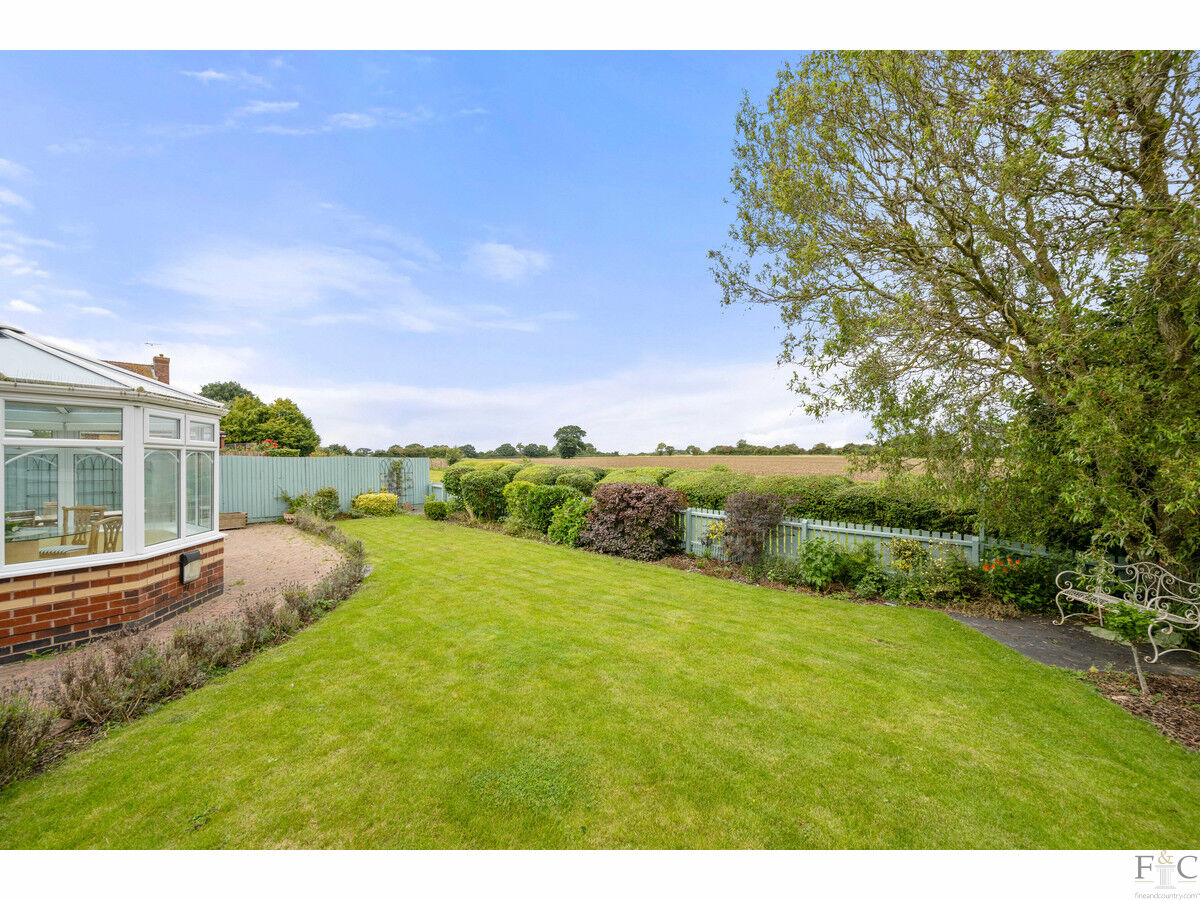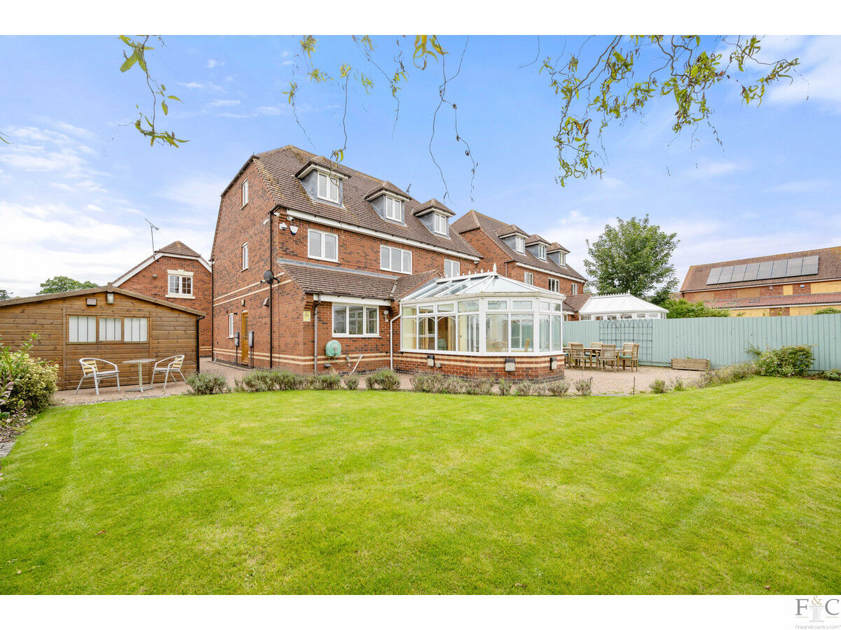 The rear garden is an ode to meticulous landscaping and planning. It offers a sophisticated blend of both patio and lawn areas that make for versatile outdoor living—whether it's alfresco dining you seek or simply a tranquil space to lounge and soak in nature's beauty. The garden faces south, enjoying a warm embrace in winter and a cool touch in the summer while offering glorious views of both sunrise and sunset. What's more, the property is blessed with breathtaking views over expansive fields that stretch as far as the eye can see. For those in need of extra storage or a workshop, a large shed is discreetly situated at the side of the property, proving that functionality and beauty can indeed coexist harmoniously.