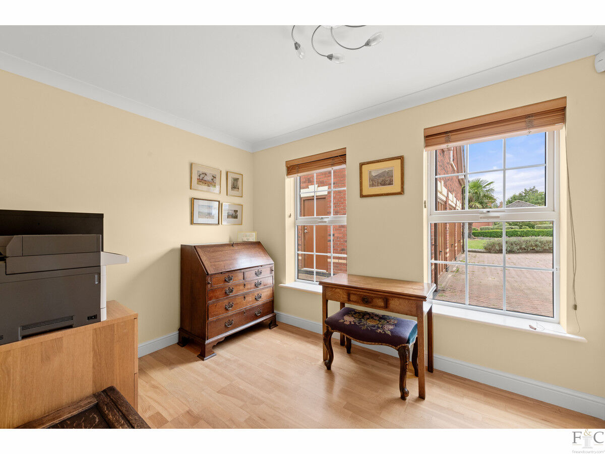 The dedicated study is a haven for productivity or contemplative thought, with dual windows that bathe the room in sunlight and inspire a mood of focused serenity.