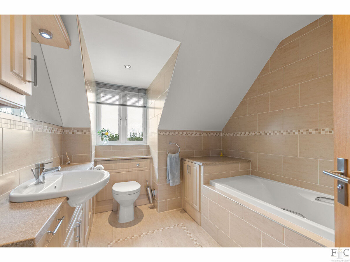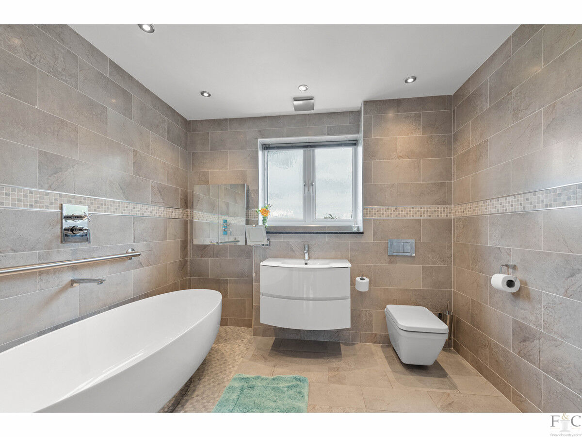 Family Bathroom: The comprehensive family bathroom is replete with a bath, an overhead shower, and vanity units for uncompromised luxury.