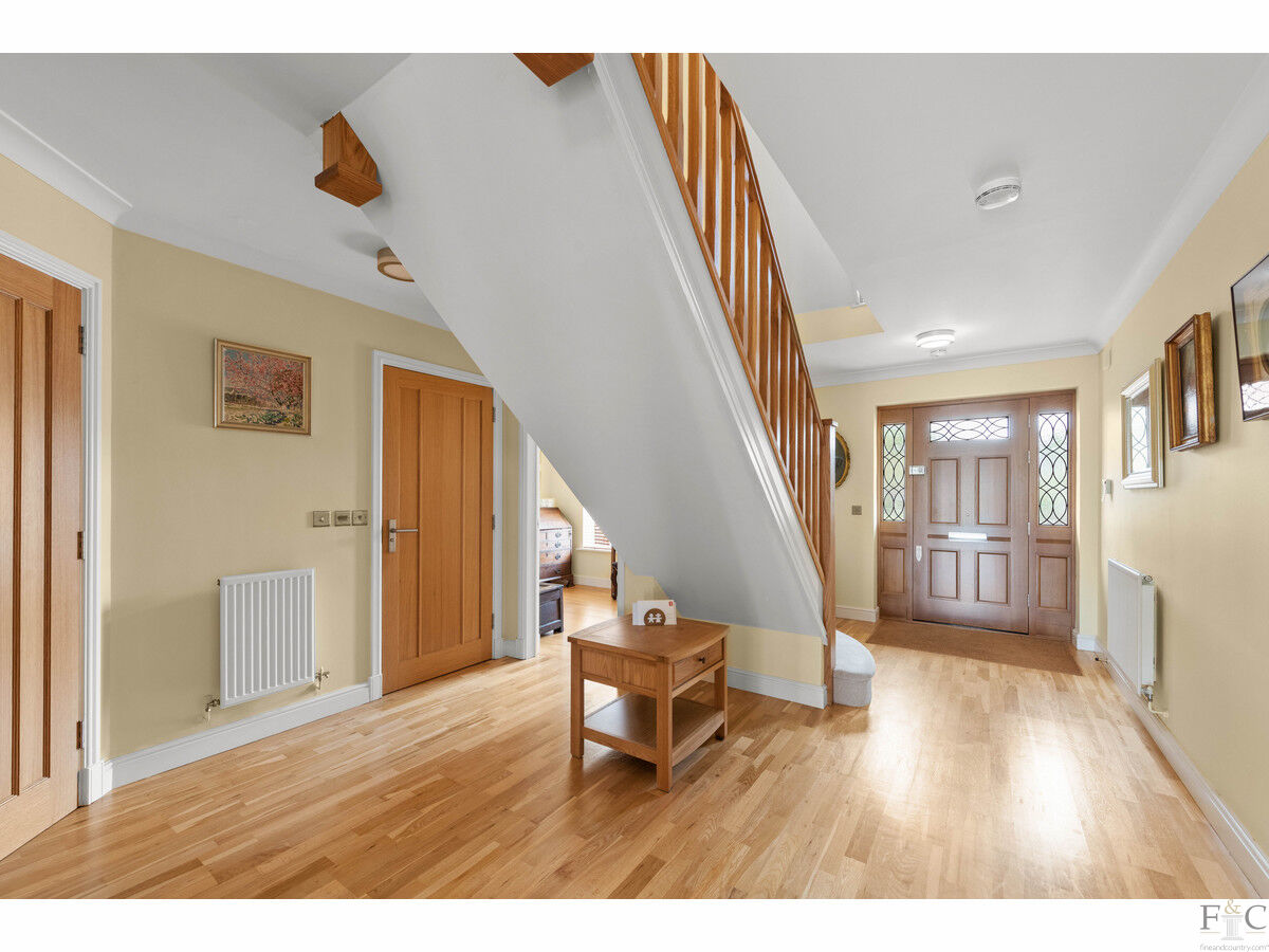 Your first steps inside reveal a grand entrance hall that sets the tone for the opulence that unfolds. Highlighted by engineered oak flooring, and guarded by a bespoke 57mm thick oak door featuring multi-point security, this hall isn't just an entry—it's an experience.
