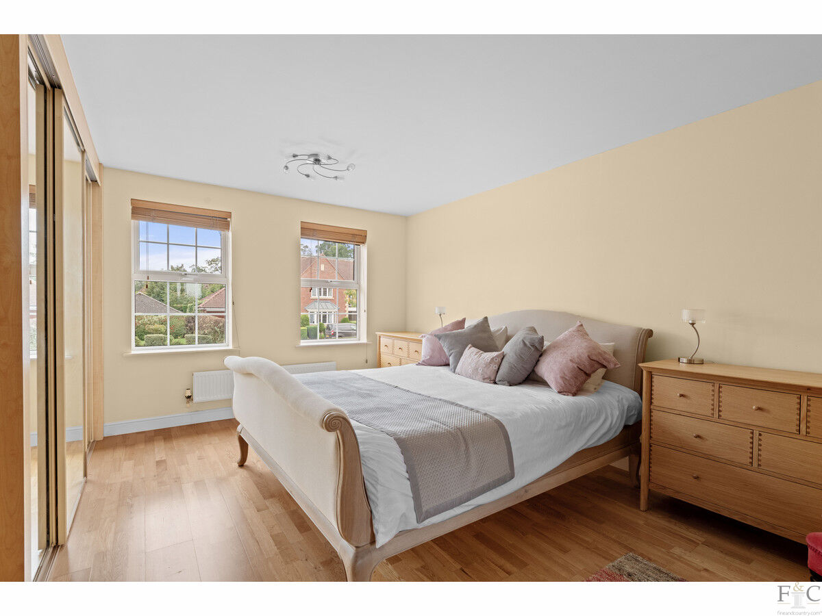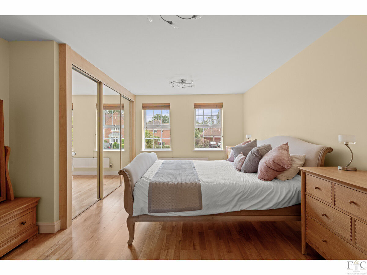 Ascend to a realm of unparalleled luxury in the master suite, adorned with engineered oak flooring and dual windows for a harmonious infusion of natural light. The suite also features fitted mirrored wardrobes that not only provide ample storage but also create a sense of boundless space. A dressing area with fitted storage leads you into your private sanctuary—an ensuite bathroom graced with a freestanding bath, floor-to-ceiling tiles, and frosted privacy glass.