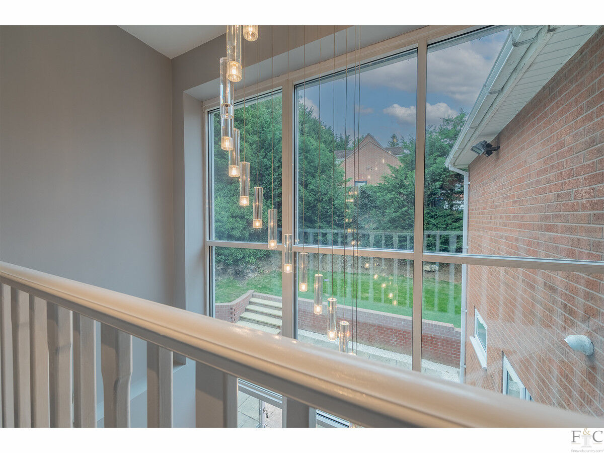 Ascend to the galleried landing, where a cascade of pendant lights glimmers against a tall picture window, flooding the hallway with radiance. Here, the sense of space and drama is undeniable.