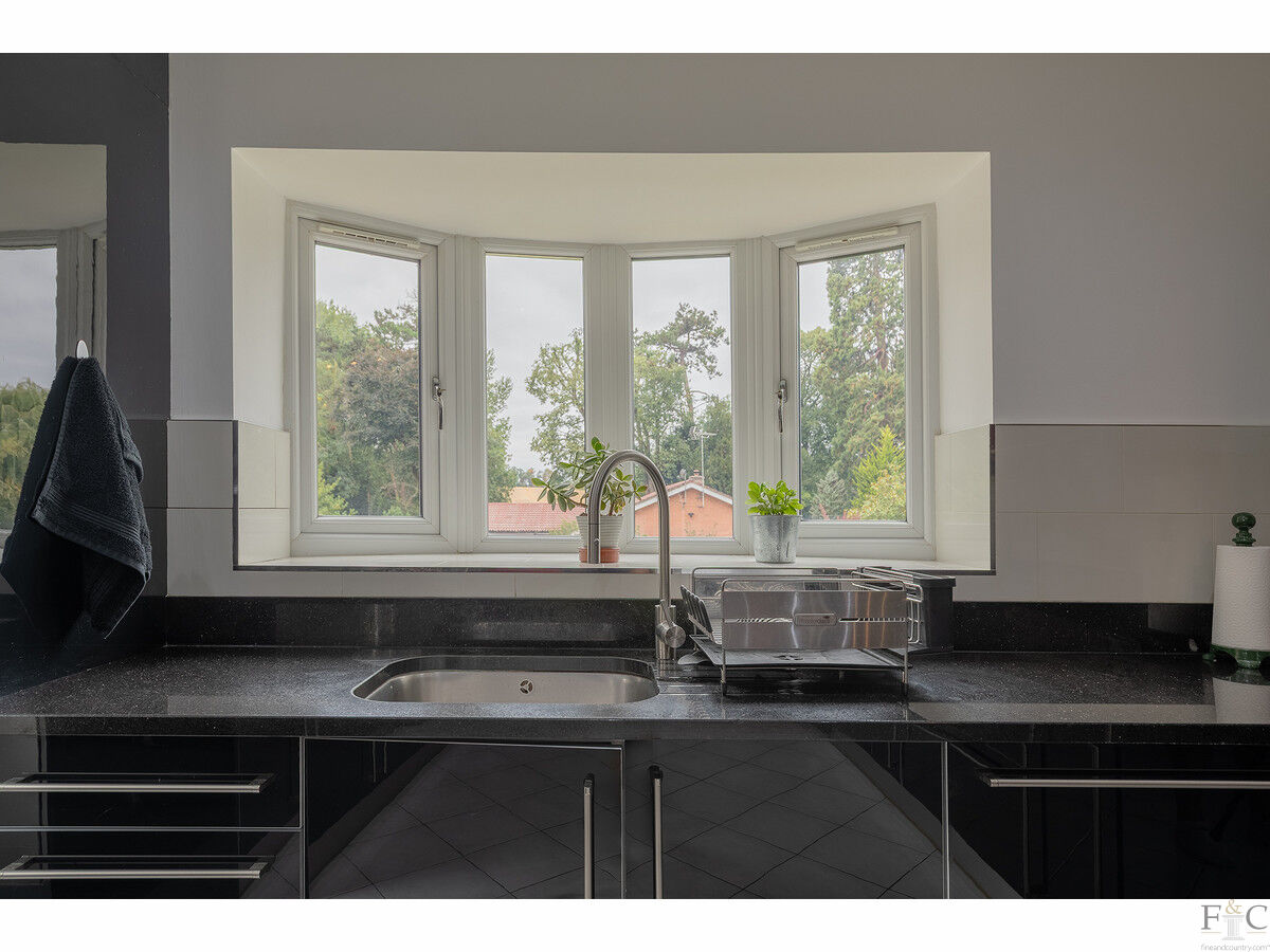 - Sleek modern kitchen with integrated appliances and formal dining room