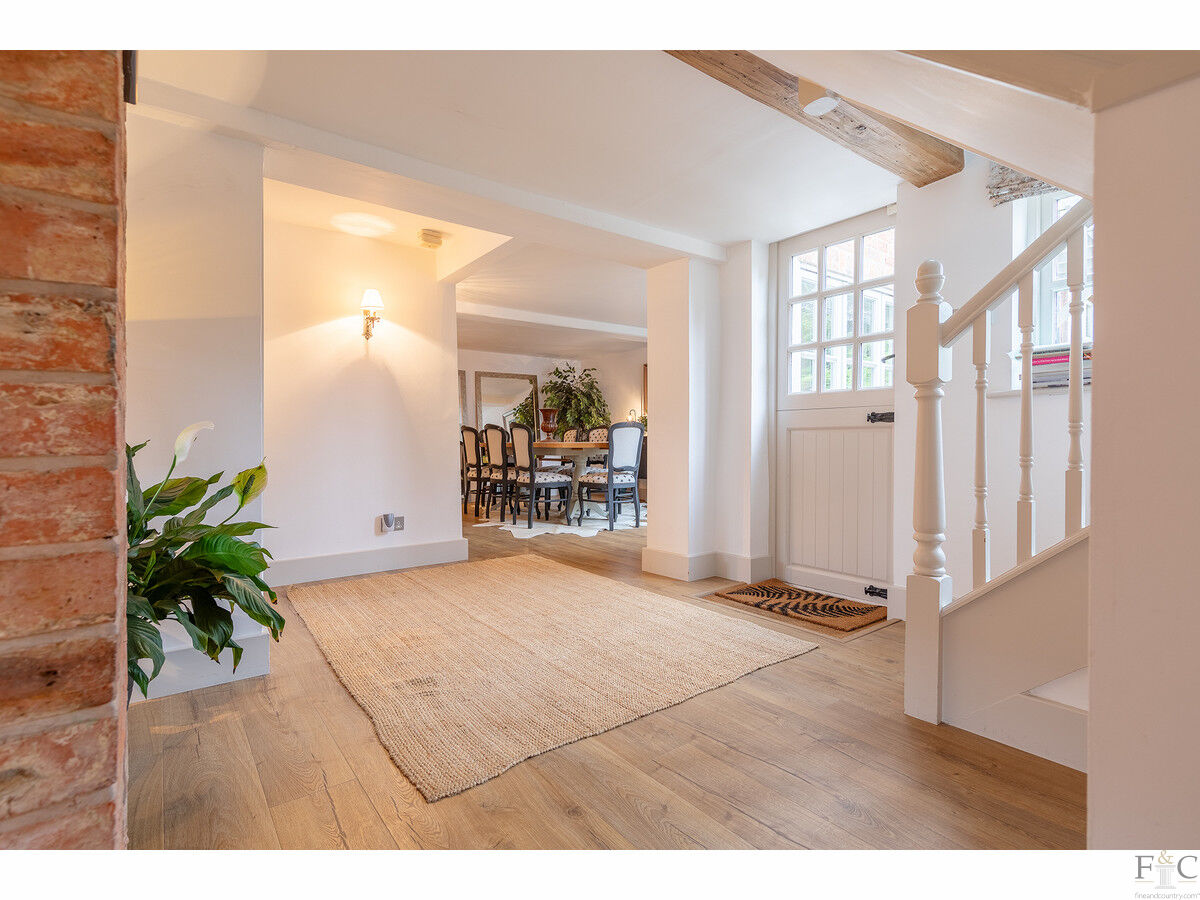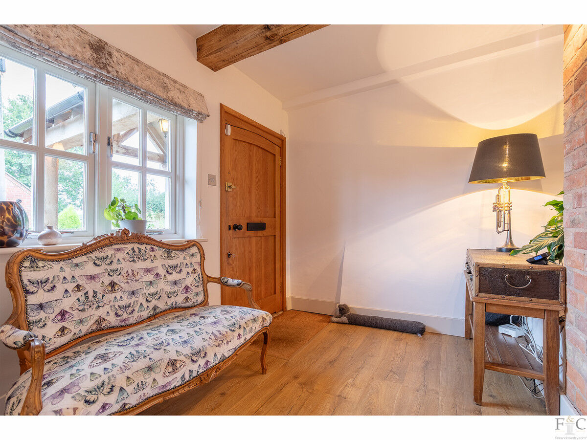 The property is entered through a charming oak-framed storm porch, leading into a welcoming and spacious entrance hall. With exposed brickwork, oak flooring, and a beautiful dog-leg staircase rising to the first floor, this inviting space sets the tone for the rest of the home.