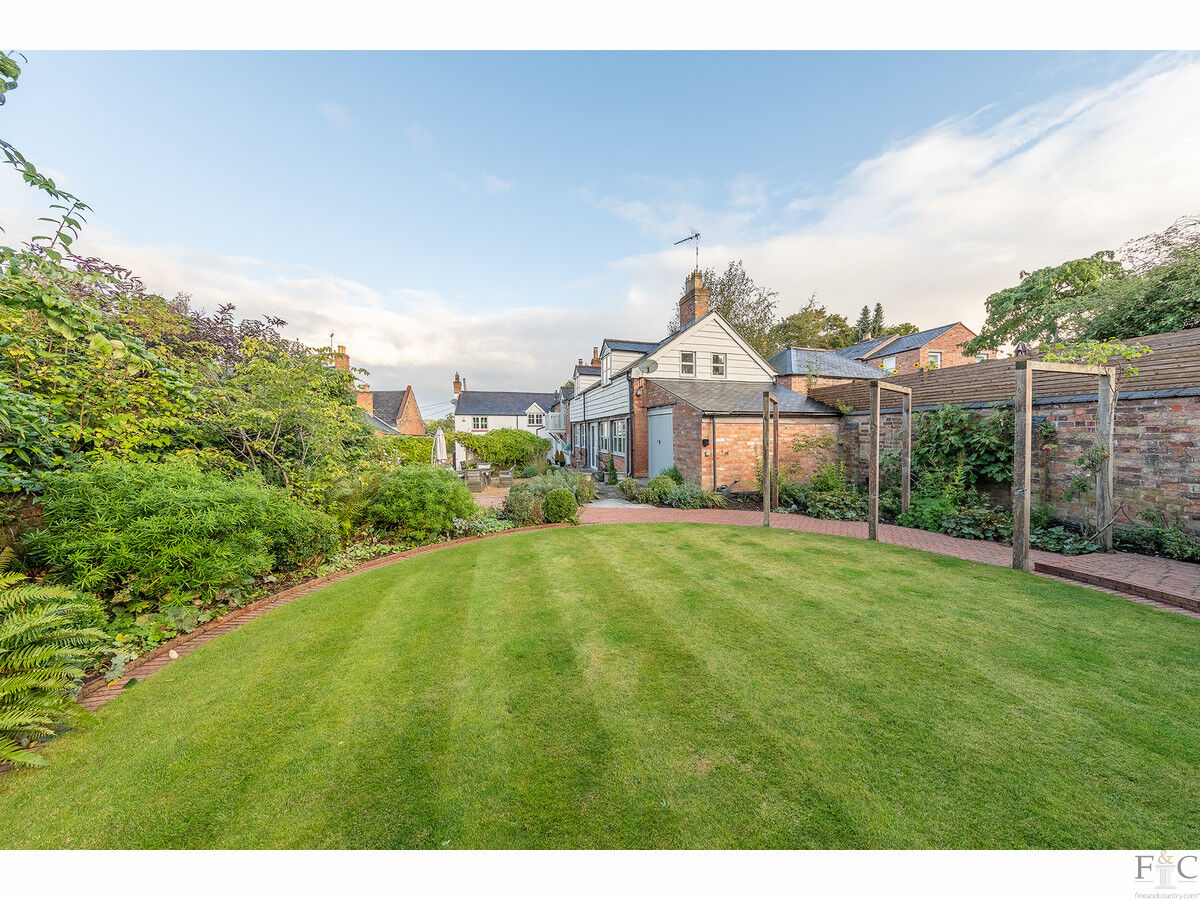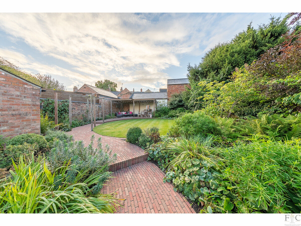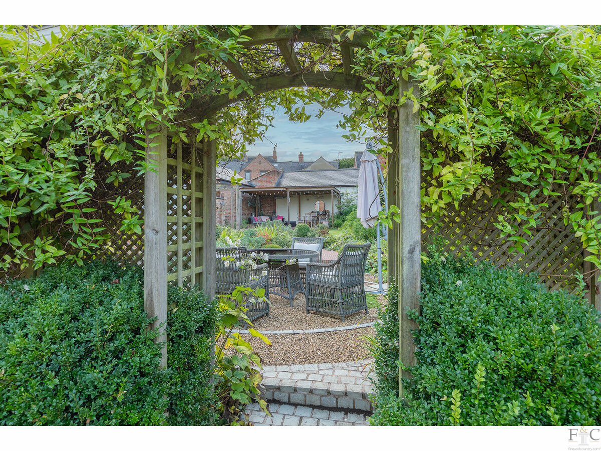 The rear garden is a lovely feature, beautifully designed, and private, offering several seating areas that enjoy the sun at different times of the day. It’s a stunning retreat, a space to lose yourself in, with mature borders, a formal gravelled dining area, and a brick-paved pathway meandering through planted archways and a lawned garden.