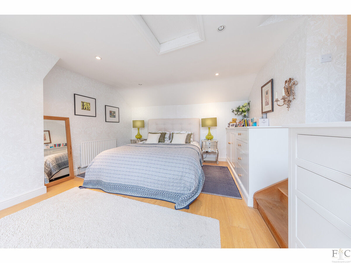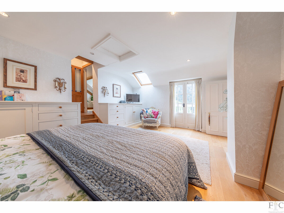 The master suite is a true retreat, featuring a Juliette balcony that fills the space with natural light. Its luxurious ensuite, complete with a freestanding bath and walk-in shower, offers a spa-like experience. An adjoining bedroom, currently used as a dressing room, is fitted with built-in wardrobes, providing excellent storage while enhancing the master suite’s practicality.