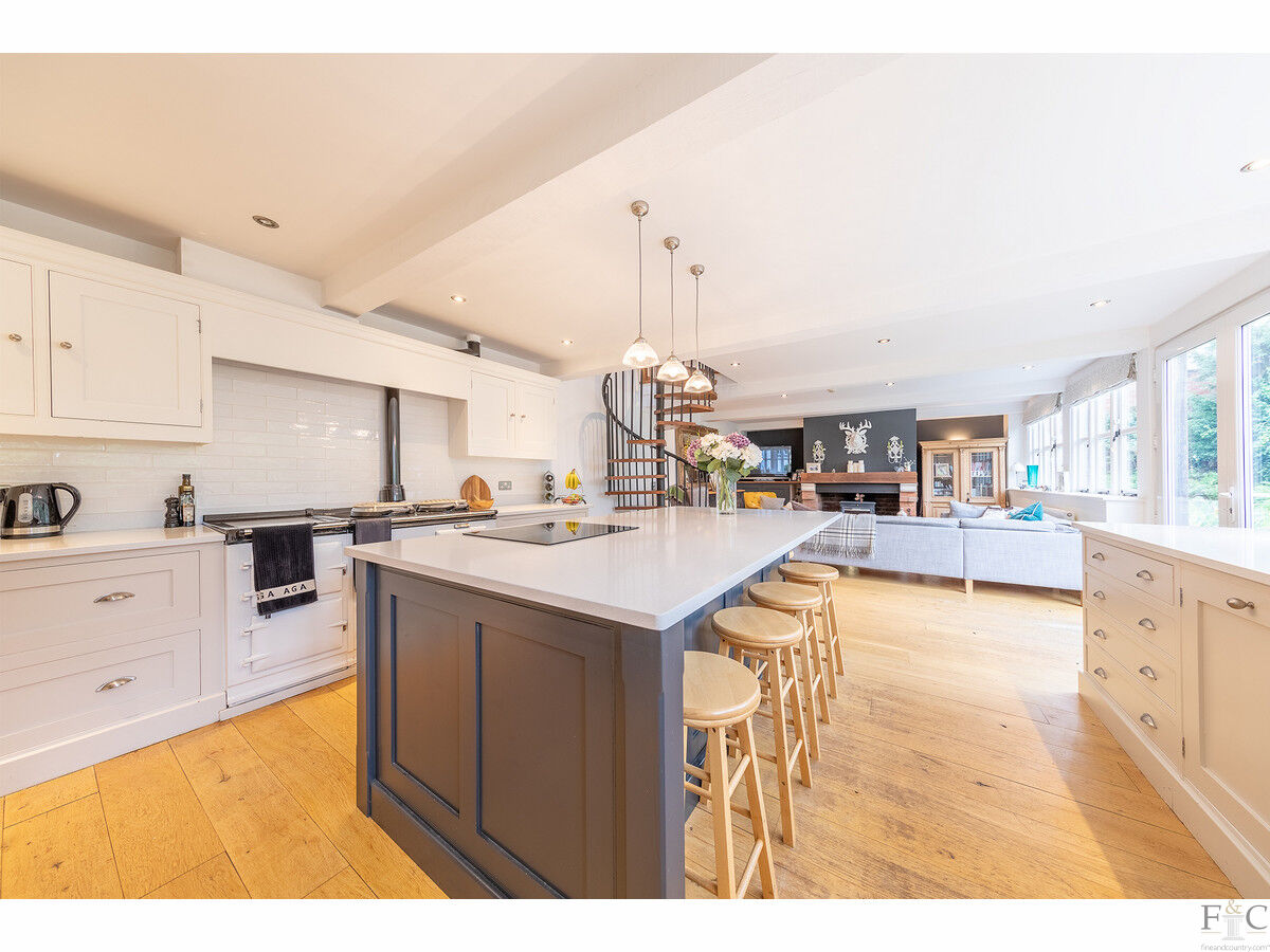At the heart of the home is a stunning open plan living, kitchen and dining area, complete with a large central island and Aga, creating the perfect space for both everyday living and entertaining. The property offers spacious, flexible accommodation, seamlessly blending period charm with contemporary style.